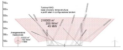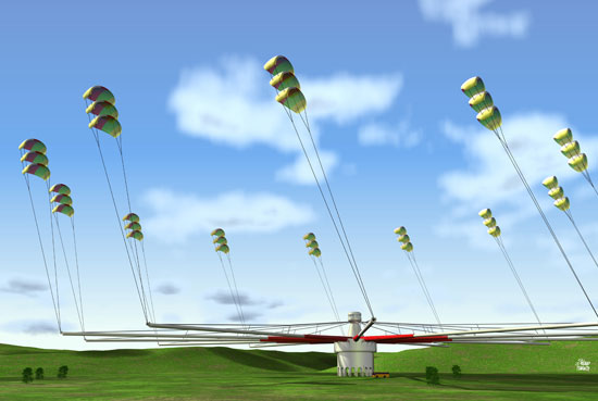 C'est probablement aujourd'hui le projet le plus impressionnant. Le Kite Wind Generator, alias KiteGen, ou KWG, ou encore KiWiGen, fournirait des dizaines de mégawatts (MW) grâce aux vents soufflant à plusieurs centaines de mètres d'altitude. Le principe est original: un manège porte des bras pivotants sur lesquels sont accrochés de très longs câbles reliés à des cerfs-volants. La position de ces derniers est contrôlée électroniquement et l'ensemble fait tourner le manège qui entraîne une turbine: