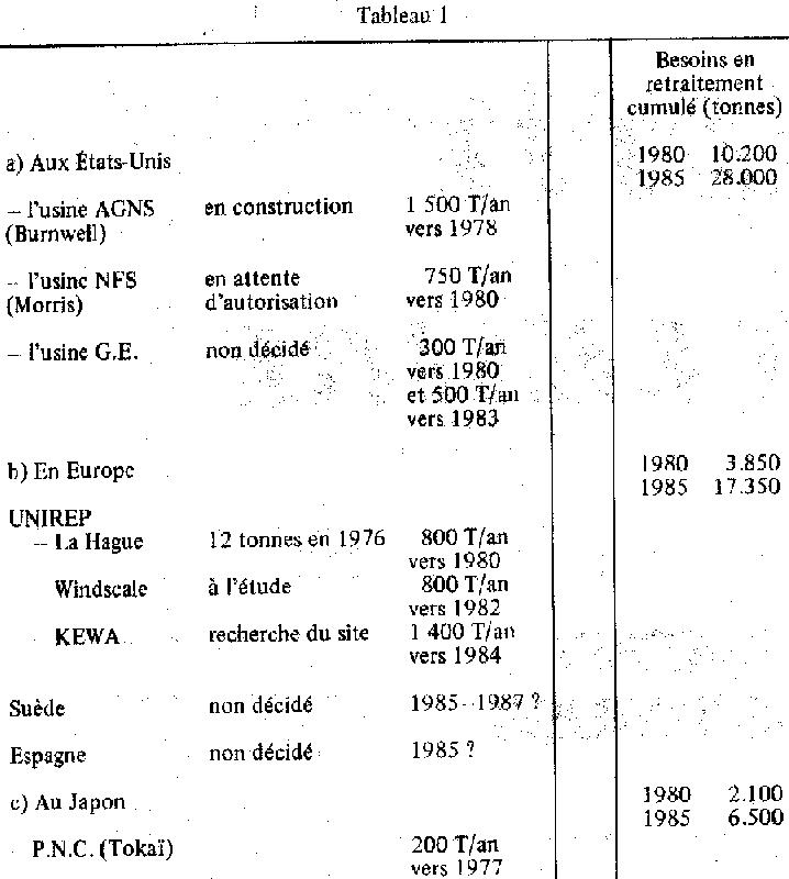 En tout état de cause, même si tous ces projets voient le jour, et à supposer que les programmes électronucléaires se déroulent comme prévu, il existera chaque année des centaines puis des milliers de tonnes de combustibles irradiés non retraités s'accumulant dans des piscines, d'abord sur les sites des centrales nucléaires, puis bien vite dans les centres de retraitement où on sera amené à construire de nouvelles capacités de stockage. Reprenant les chiffres donnés par J. Couture[1], ces stocks pourraient atteindre en 1985 environ 6.000 t aux Etats-Unis, 4.000 en Europe, et 4.000 au Japon. Evidemment, contrairement aux combustibles peu irradiés de la filière graphite-gaz, on peut en principe stocker sur plusieurs années les combustibles oxydes dans des piscines (cela pose tout de même de sérieux problèmes de recyclage de l'eau de ces piscines à cause du fissurage des gaines, à moins qu'on ne la vidange de temps en temps à la mer, comme cela s'est produit à La Hague aux piscines 900 et 901 lors du démarrage de H.A.O. cette année[2]. Il faudra néanmoins, pour des raisons de sécurité et de stockage, procéder finalement à une sorte de retraitement. Mais si celui-ci est actuellement «un passage obligé», c'est plutôt comme conséquence inéluctable du développement massif de la production d'électricité d'origine nucléaire. p.1
