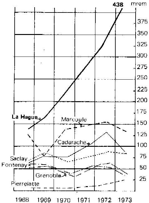 L'unique usine de retraitement actuellement encore en fonctionnement dans le monde [2] , celle de la Hague, n'est pas adaptée au retraitement des déchets des nouvelles centrales (PWR) et soumet ses employés à des doses croissantes d'irradiation. Annexe 4 Les travailleurs de la Hague sont de plus en plus irradiés. «L'électronucléaire en France», Syndicat CFDT du CEA, p.359: De plus, les centrales nucléaires étant disséminées sur tout le territoire, le retraitement se faisant à la Hague, des produits très radioactifs devront être transportés en quantité importante, par la route et le train.