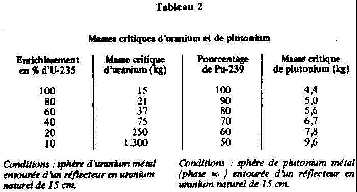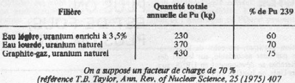 Le tableau 1 montre en effet la quantité de plutonium (avec le pourcentage de Pu-239) que l'on peut extraire annuellement d'un réacteur de 1.000 MW(e) selon la filière utilisée: ![]() ![]() Ces chiffres appellent les remarques suivantes: