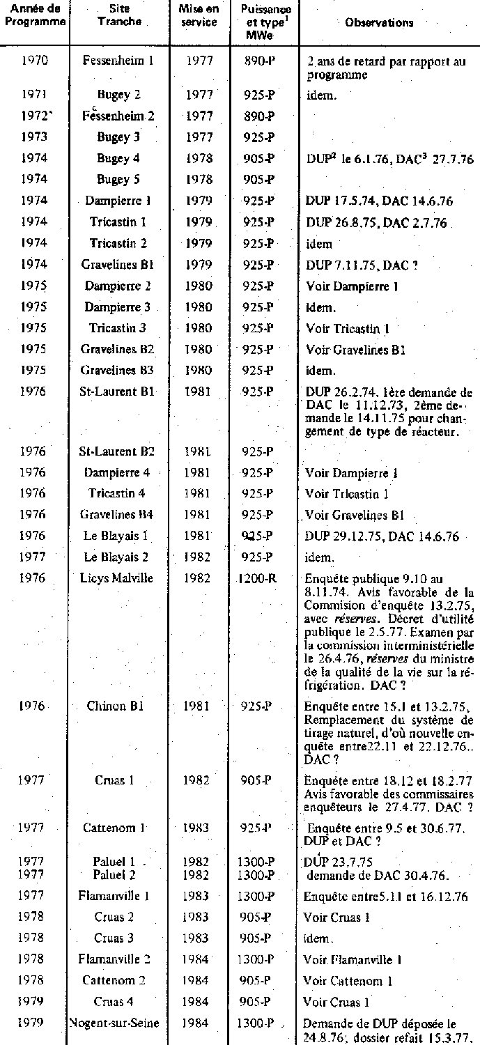 8. Seul le nucléaire est capable de répondre à cette croissance des besoins en énergie: les autres sources, notamment les énergies nouvelles, ne sont pas prêtes, malgré les efforts faits: «l'énergie éolienne se prête facilement à l'initiative privée et c'est pour cela que le gouvernement a récemment encouragé une telle recherche par un concours d'idées dont les plus intéressantes feront l'objet de suites favorables». Grâce au «Concours Lépine», la crise de l'énergie ne sera bientôt qu'un mauvais souvenir!! Pour finir ce rappel des positions officielles, nous donnons ci-après le programme tel qu'il était envisagé au début de cette année. On peut remarquer tout de suite que la durée de construction d'une tranche nucléaire est de cinq ans dans le programme, alors qu'il en a fallu sept pour Fessenheim et qu'aux EtatsUnis on en est maintenant plutôt à neuf ans à cause des difficultés financières et de l'opposition de plus en plus vive aux implantations. N'en sommes-nous pas là en France aussi? D'ailleurs, M. Boiteux semble maintenant reconnaître que les deux ans de retard de Fessenheim se répercuteront sur tout le programme. p.2