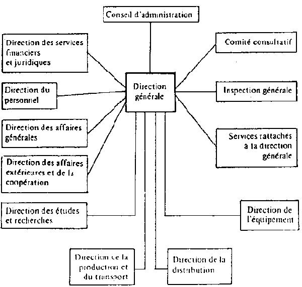 On voit ainsi que l'indépendance n'est donnée que pour la gestion. L'idée essentielle est de «rentabiliser le secteur public» et par conséquent de gommer sérieusement la notion de Service Public ou au moins de l'encadrer dans des limites financières étroites. Notons au passage la croyance tranquille des «grands commis» de l'époque en une stabilité économique permettant de projeter longtemps d'avance le fonctionnement des établissements. 4 ans plus tard, c'était la guerre du Kippour! Le titre III, et plus particulièrement l'article 20, précise le fonctionnement de l'établissement au niveau le plus haut: le Conseil d'Administration. Les services nationaux d'Electricité de France et de Gaz de France sont administrés chacun par un conseil de quinze membres nommés pour cinq ans par décret pris sur le rapport du Ministre de l'industrie et du Commerce, à savoir: 1 - Cinq représentants de l'Etat, désignés; deux sur le proposition du Ministre de l'Industrie et du Commerce; deux sur la proposition du Ministre des Finances et des Affaires économiques; un sur la proposition du Ministre de l'Agriculture; en ce qui concerne Electricité de France ou sur la proposition du Ministre des Travaux publics, des Transports et du Tourisme en ce qui concerne Gaz de France. 2. Cinq personnalités désignées en raison de leur compétence en matière industrielle et financière, dont au moins deux représentants des collectivités locales ayant institué des distributions d'électricité et de gaz; 3. Cinq représentants du personnel, désignés sur la proposition des organisations syndicales les plus représentatives de ce personnel. Au cas où l'un des membres du Conseil cesse d'appartenir au Conseil d'Administration au cours de la période prévue pour son mandat, son remplaçant n'est nommé que pour le temps restant à courir jusqu'à l'expiration de la dite période. Le Président du Conseil d'administration, choisi parmi les administrateurs, est nommé, sur proposition du Conseil d'administration, par décret pris en Conseil des Ministres, sur le rapport du Ministre de l'Industrie et du Commerce. Les fonctions de Président et de Directeur général ne peuvent être remplies par la même personne. En cas de partage des voix, la voix du président est prépondérante. Les directeurs généraux des services nationaux sont nommés sur la proposition du Conseil d'administration par décret, délibéré en conseil des Ministres, pris sur le rapport des Ministres de l'Economie nationale et de la Production industrielle et choisis parmi les personnali tés de compétence éprouvée dans la profession... Le Conseil d'Administration n'est pas tripartite. La composition actuelle du Conseil d'Administration est donnée dans le tableau colonne suivante. Pour finir sur cette loi de nationalisation, il est intéressant de signaler l'article 22 qui avait prévu que la distrihution de l'électricité serait confiée à des services locaux autonomes. En fait, ceci n'a pas été réalisé, le décret n'ayant jamais été publié; la centralisation a prévalu et actuellement toutes les activités de Distribution sont réunies dans une Direction Nationale. Pourtant, le projet était intéressant. Article 22