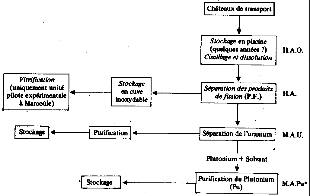 Une unité telle que UP2 comprend un atelier de dégainage et dissolution (HAOE) pour les combustibles Graphite-Gaz, une unité de séparation des P.F. (HA) et 2 ateliers de séparation, purification et conditionnement de l'uranium (MAU) et du plutonium (MAPu). Pour les combustibles oxydes[13], on a construit HAO (Haute activité oxyde) en 1976, où s'effectue le cisaillage et la dissolution et qui remplace (HADE). La suite des opérations est ensuite la même que pour les combustibles graphite-gaz. Les effluents gazeux (essentiellement 85Kr) sont rejetés par la cheminée de ventilation de UP2 après un filtrage «absolu» à la sortie. Les résidus des diverses opérations chimiques sont traités au (STE) (Service de Traitement des Effluents) avant d'être rejetés à la mer pour les rejets liquides ou stockés pour les déchets solides ou boues. On trouvera ci-dessous, sous forme d'un schéma, le cheminement du combustible provenant des réacteurs à eau légère à travers l'usine de la Hague: |