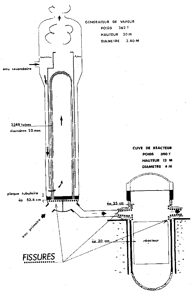 Il s'agit là d'un défaut qui affecte très probablement une vingtaine de réacteurs nucléaires identiques et peut donc mettre en cause la capacité du programme nucléaire français d'assurer dans des conditions normales de sécurité l'approvisionnement en électricité officiellement prévu. En effet, le temps nécessaire à la mise au point des appareils de contrôle, aux contrôles, aux réparations éventuelles des pièces de cuves, le remplacement éventuel des générateurs de vapeur, peut retarder de plusieurs mois, voire de plusieurs années, la mise en service des réacteurs prêts à démarrer. Des interrogations fondamentales se posent donc: - pour les réacteurs nucléaires de ce type en fonctionnementt (Fessenheim 1 et 2, Bugey 2, 3, 4, 5), - pour les réacteurs en instance de chargement du combustible (Tricastin 1, Gravelines l, Dampierre I ). 2. FICHE TECHNIQUE