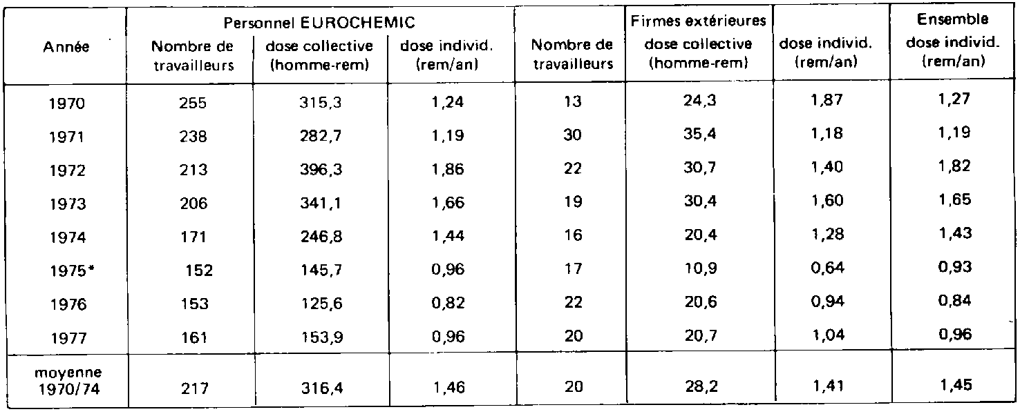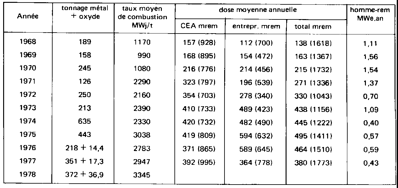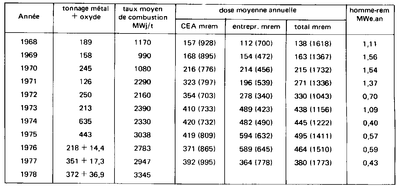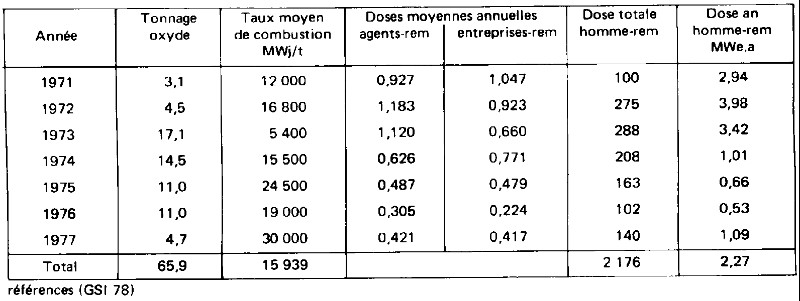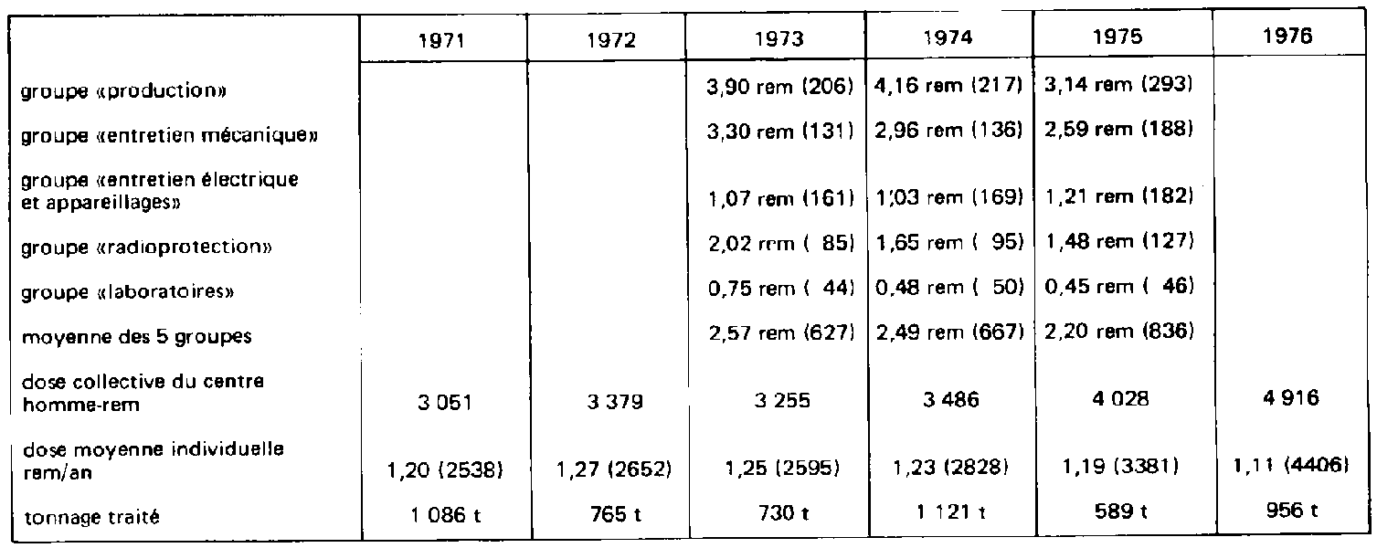- dose collective: en homme/rem - taux de combustion: en mégawatt (thermique).jour Les valeurs moyennes sont regroupées au tableau IV. En excluant le centre de West Valley, où les doses moyennes avaient atteint des niveaux inacceptables, nous voyons cependant que le débit de dose moyen annuel se situe dans la gamme de 0,4 à 1,5 rem/an environ et que le nombre d'homme-rem par mégawatt(e) an varie entre 0,7 et 2,3 environ. La figure 1 illustre les variations de doses moyennes annuelles. Nous voyons que la valeur moyenne de 0,5 rem par an est bien dépassée, car le nombre de personnes pris en compte pour le calcul dépasse largement les seuls travailleurs directement affectés aux travaux sous rayonnements. Les valeurs relatives à des groupes de travailleurs de Windscale illustrent bien cette remarque. |