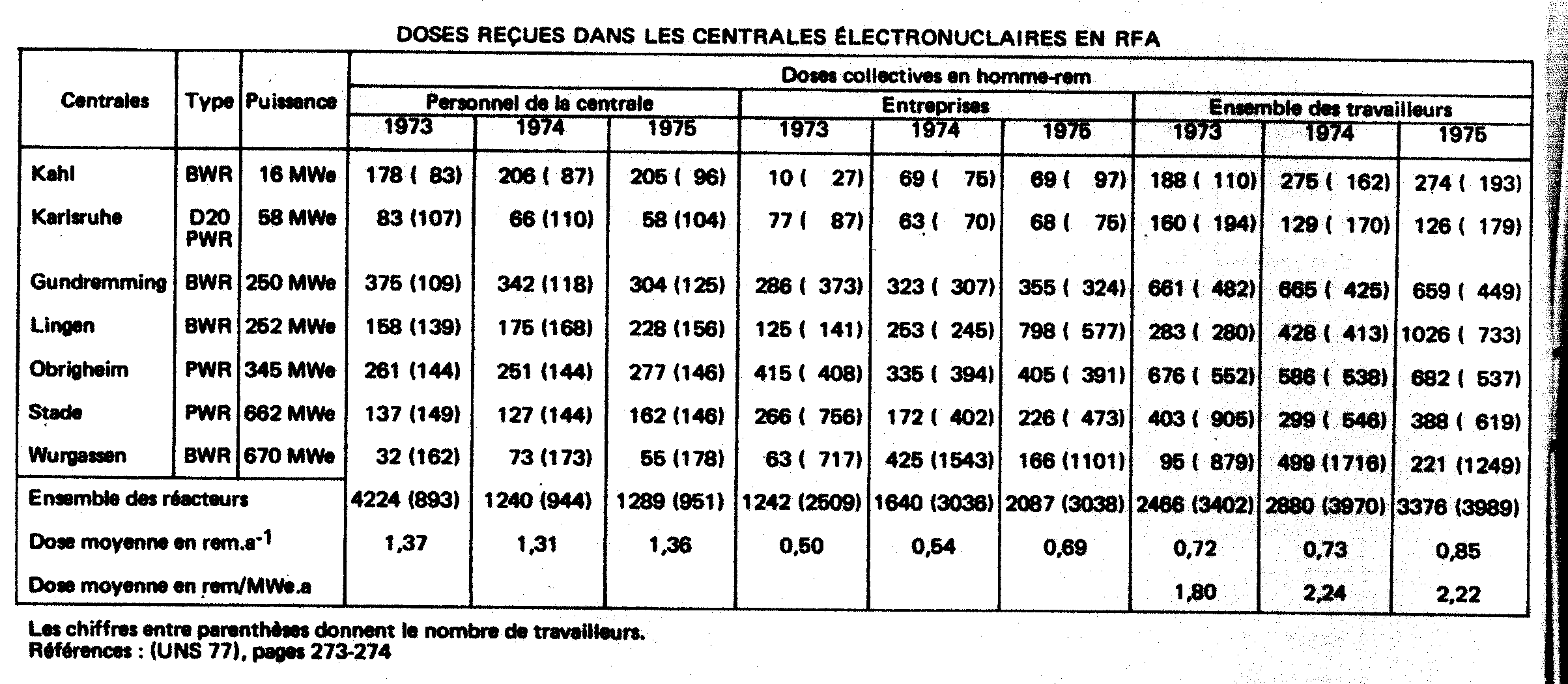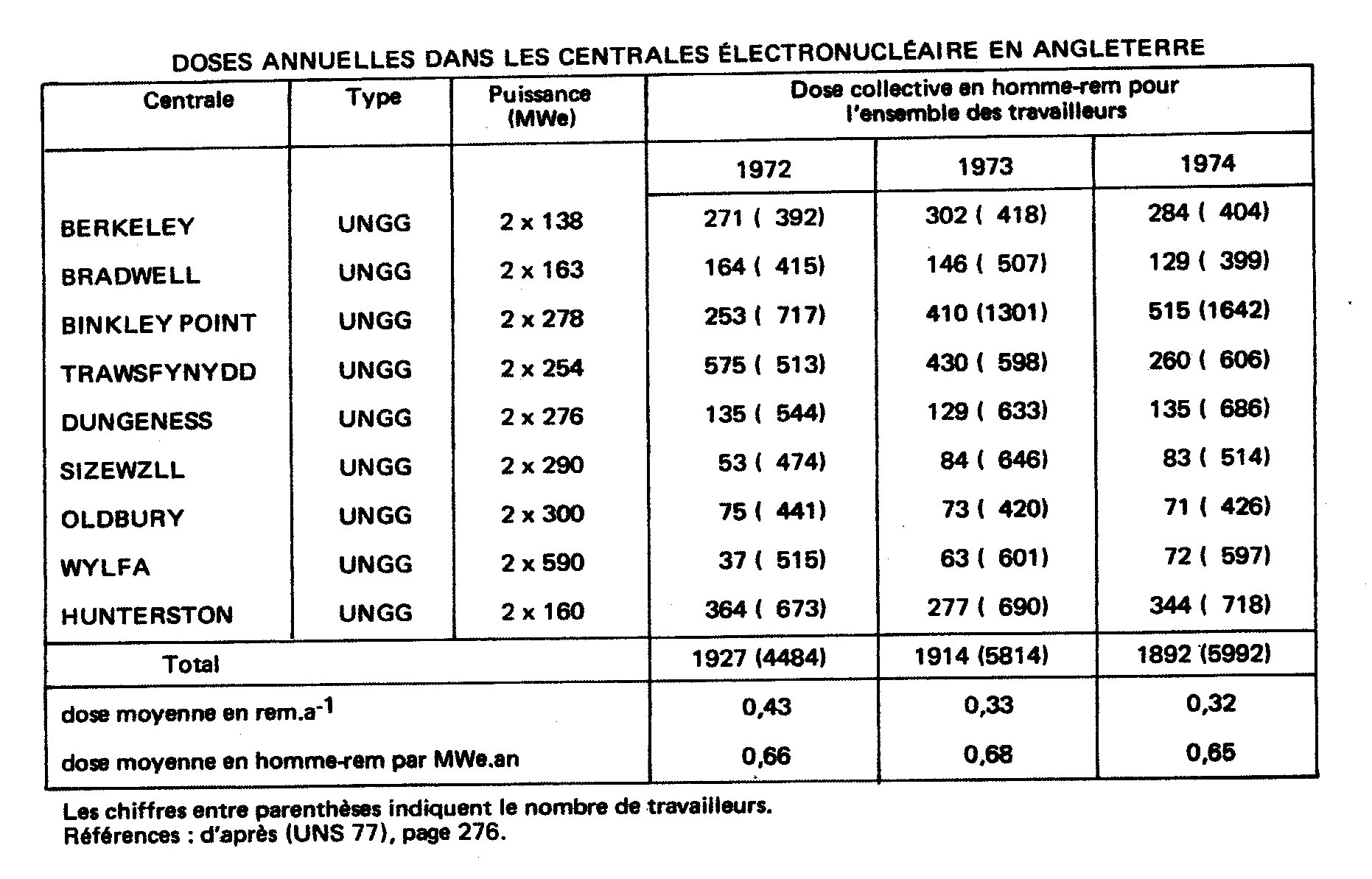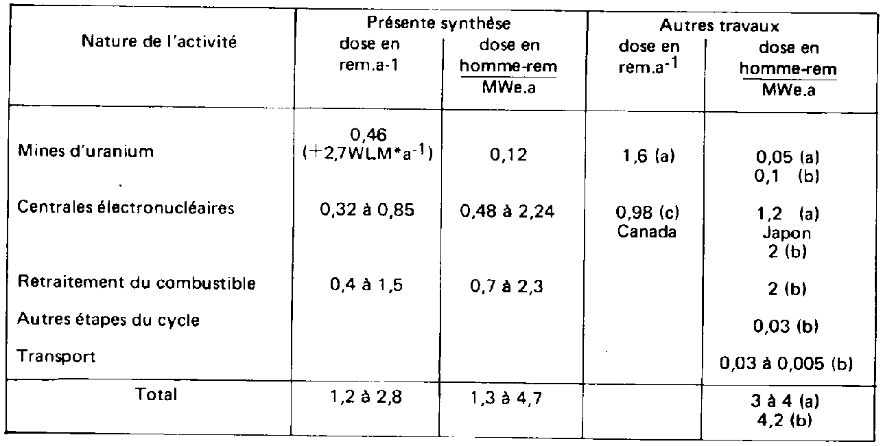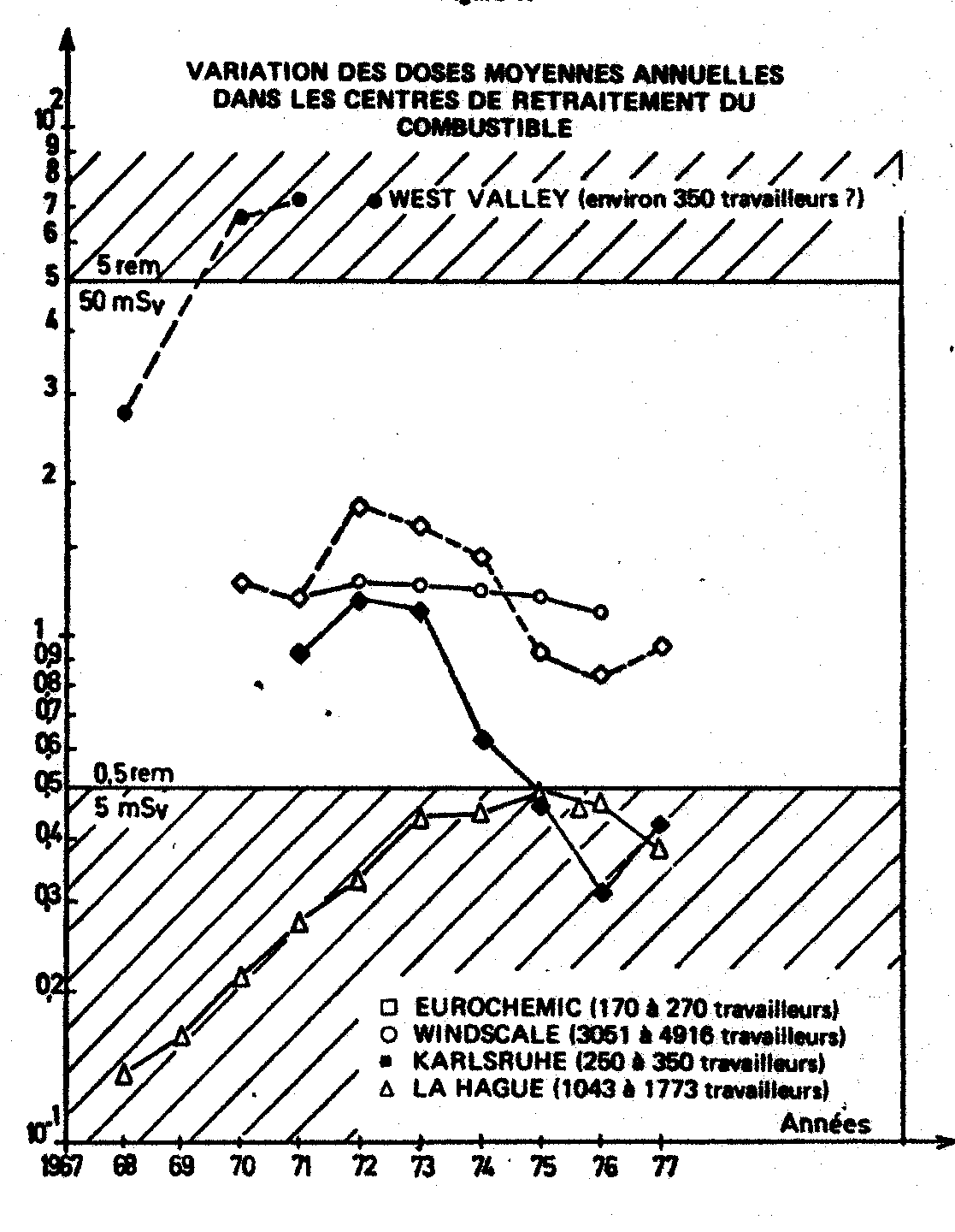 - dose collective: en homme/rem - taux de combustion: en mégawatt (thermique).jour Les valeurs moyennes sont regroupées au tableau IV. En excluant le centre de West Valley, où les doses moyennes avaient atteint des niveaux inacceptables, nous voyons cependant que le débit de dose moyen annuel se situe dans la gamme de 0,4 à 1,5 rem/an environ et que le nombre d'homme-rem par mégawatt(e) an varie entre 0,7 et 2,3 environ. La figure 1 illustre les variations de doses moyennes annuelles. Nous voyons que la valeur moyenne de 0,5 rem par an est bien dépassée, car le nombre de personnes pris en compte pour le calcul dépasse largement les seuls travailleurs directement affectés aux travaux sous rayonnements. Les valeurs relatives à des groupes de travailleurs de Windscale illustrent bien cette remarque. |