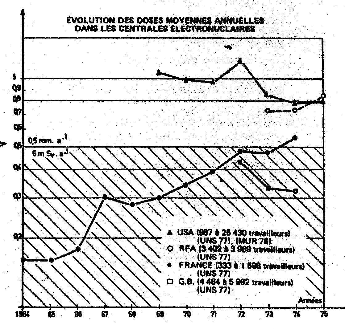 (KNE 78) : Kneale G., Stewart A., Mancuso T.F. - Reanalysis of data relating to the hanford study of the cancer risks of radiation workers. International symposium on the late biological effects of ionising radiation. IAEA. Vienne March 1978. (LUT 77) : Lutz H.R., Kuffer K. and Schenk K. - Operating experience with 13 Light-Water Reactors in Europe. Nuclear Safety vol. 18, n°5 - oct. 1977, pp. 666-675. (MAN 77) : Mancuso T.F., Stewart A. Kneale G. - Radiation exposures of Hanford workers dying from cancer and other causes. Health Physics vol 33, n°5, pp. 369-384, 1977. (MUR 76) : Murphy T.D. and Hinson C.S. - Occupationnal radiation exposures at LWRS, 1969-1974. Nuclear Safety - Vol. 17 n°5, pp. 622-625, oct. 1976. (NAJ78) : Najarian I. and Colton T. - Mortality from leukemis and cancer in Shipyard nuclear workers. The Lancet - pp. 1018-1020, 13 May 1978. (OSI 79) : Osipenco A. - Données relatives au retraitement effectué par Eurochimic. Communication privée (janvier 1979). (POC) : Pochin E. - Estimation de l'exposition de la population aux rayonnements résultant de la production d'énergie nucléaire et provenant d'autres sources. Agence pour l'Energie Nucléaire - OCDE - janvier 1976. (PRA 75) : Pradel J. et Zettwogg - La radioprotection dans l'extraction et le traitement des minerais. In Industrie minérale - Mine (novembre 1975). (RES 75) : Resnikoff M. - Sierra club testimony related to section IV E. Reprocessing Final Gesmo 1 (1977). (ROS 74) : Rossi H. and Kellerer A.M. - The validity od risk estimates of leukemia incidence based on Japanese Data. Radiation Research n°58, p. 131, 1974. (ROS 78) : Rossi H. and Mays C.W. - Leukemia risk for neutrons. Health Physics Vol. 34, pp. 353-360 (1978). (SEV 76) : Sevc 1., Kunz E. and Placek V. - Long cancer in uranium miners and long-term exposure to radon daugter products. Health Physics, Vol. 3, pp. 433-437,1976. (STE 78) : Stewart A. et Ayme S. - Effects biologiques des faibles doses de rayonnements ionisants. Fiche technique n°35 - GSIEN - 2, rue F. Villon ORSAY (France). (TAY 78) : Taylor F .E. and Webb G .AM. - Radiation exposure of the UK Population. National Radiological Protection Board NRPB - R 77 (Nov. 1978). (UNS 72) : United Nations Scientific Committee on the effects of Atomic Radiation to the General Assembly. Ionising radiation : Levels and effects - Vol. 1 and 2 - A/8725 sippl n° 25. (UNS 77) : United Nations Scientific Committee on the Effects of Atomic Radiation (UNSCEAR). 1977 report to the General Assembly, with annexes United Nations publication - Oct. 1977. p.11 |