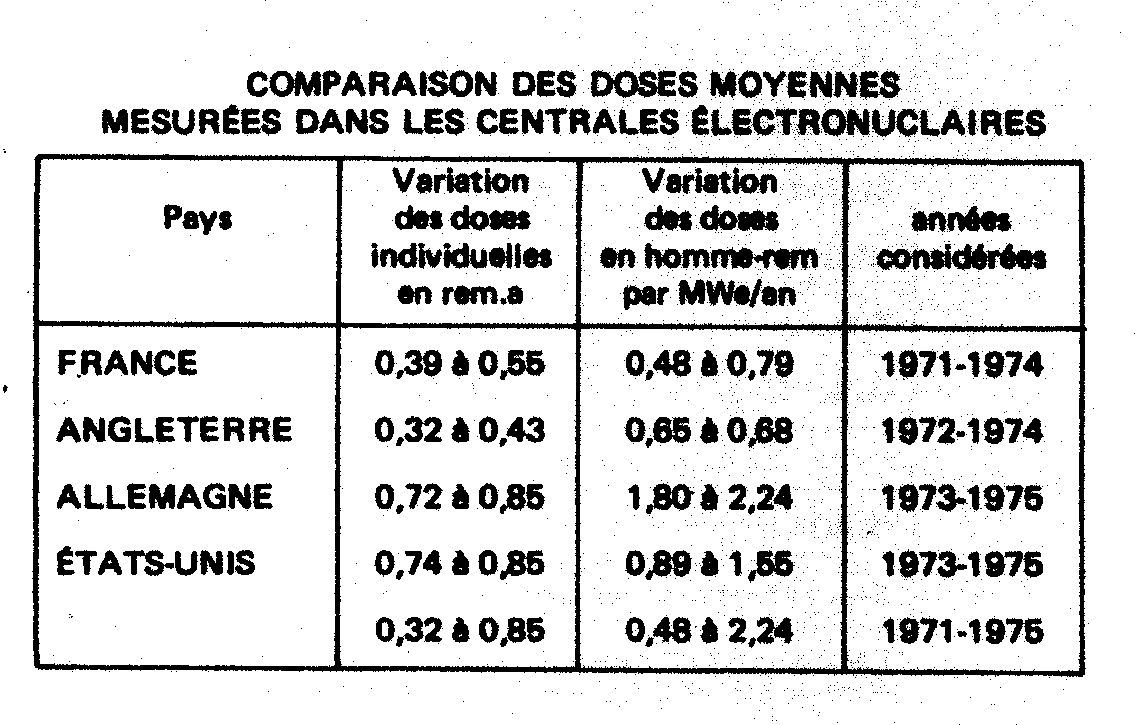 a) la thyroïde (caractère déclaré «établi»), le pharynx, le pancréas, l'estomac, le gros intestin (caractère déclaré «apparent»). b) Les critères de choix ne peuvent même pas s'expliquer, par ailleurs, par l'insuffisance des connaissances, car le tableau français des affections radio-induites énumère les différents symptômes pour lesquels il définit sept délais allant de 7 jours à 15 ans, alors qu'en Italie, pour les mêmes affections, le délai est uniformément égal à dix ans. Les ouvrières de Newark (USA), qui se sont rendues tristement célèbres en peignant des montres à cadran lumineux, n'auraient pas pu, si elles avaient été françaises, être toutes couvertes par la législation de leur pays, la France ne prévoyant un délai de prise en charge que de 15 ans pour le sarcome osseux, alors que les cancers les plus tardifs apparurent, pour certaines d'entre elles, 33 ans après la nuisance. De façon générale, on peut dire que, s'agissant de la santé individuelle des travailleurs, on est frappé par la modestie des propositions de la CIPR 26. Prenons, par exemple, le paragraphe 93: «... dans les cas exceptionnels de travailleurs qui ont subi des radios en vue d'un diagnostic ou d'une thérapeutique impliquant une forte irradiation d'une partie du corps et dont le travail impliquerait une exposition importante de ces parties du corps, la situation pour le travail devrait être examinée par l'autorité médicale compétente.» Et le paragraphe 95: «Dans le cas d'expositions médicales élevées (ex. pour une radiothérapie), ce serait les doses provenant de ces expositions qui prédomineraient et l'estimation des risques possibles d'effets non stochastiques (ex. sur le cristallin) serait du ressort des instances médicales chargées du traitement du patient plutôt que la tâche de celles qui sont responsables de la radioprotection en général.» Ainsi, au lieu d'inviter le législateur à prendre des décisions claires, la commission se contente de considérer le problème comme une simple répartition de tâches entre la médecine individuelle et la médecine du travail. Lorsqu'on sait que la majeure partie des «expositions médicales élevées» concerne le traitement du cancer, les considérations de la commission sur le risque de « cataracte» sont étonnantes: Envisage-t.elle que l'on puisse laisser en zone active un travailleur soumis à une radiothérapie? Les travailleurs migrants A l'intérieur d'un même pays, on observe, dans les pays capitalistes au moins, que la dose collective annuelle se partage entre les personnels de la centrale ou du centre de retraitement, et les travailleurs des entreprises extérieures, Ces derniers voient leur part augmenter et devenir parfois majoritaire. Nous allons prendre deux exemples en donnant le pourcentage de la part de la dose collective. (suite)