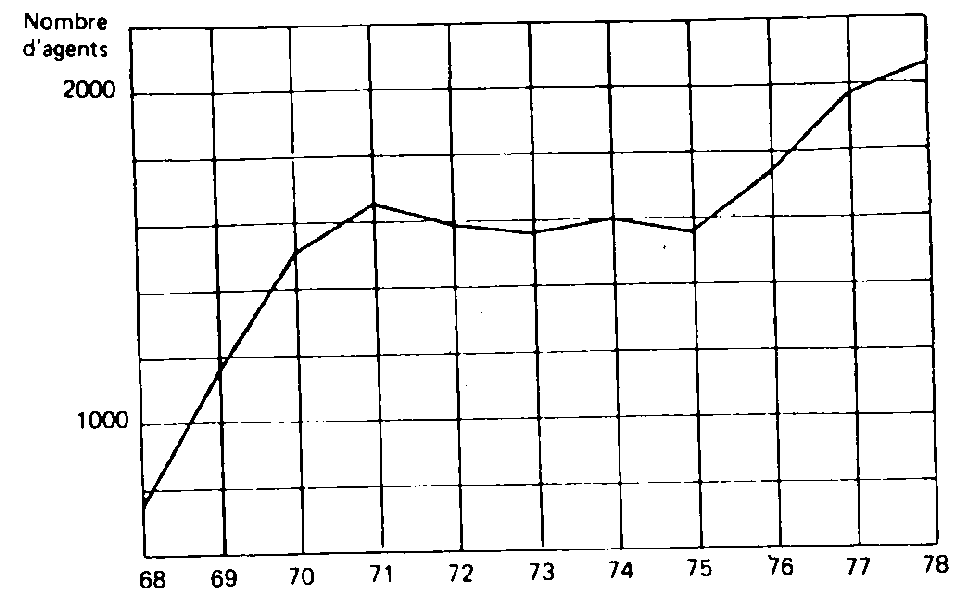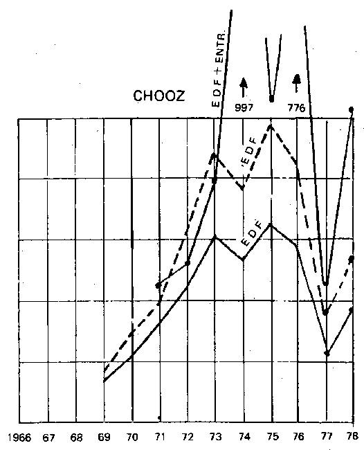 Malheur au non statutaire Répartir la dose: La dose collective de 500 hommes-rem par an étant a priori présentée comme inéluctable (voir le texte en provenance d'EDF dans ce même numéro), la règle «aussi bas que possible» devient: «ne pas dépasser les doses maximales», et par conséquent «répartir la dose»... Comme il n'est pas question d'augmenter à l'infini un effectif EDF fortement syndiqué, non licenciable, toujours prêt à revendiquer et à se mettre en grève pour un oui ou pour un non, on préfèrera acheter de la «viande à rem» à l'extérieur. A titre d'exemple, voici la répartition de la dose collective entre personnel statutaire et personnel extérieur à la centrale de Chooz de 1971 à 1978: EVOLUTION DES DOSES COLLECTIVES A LA CENTRALE DE CHOOZ
