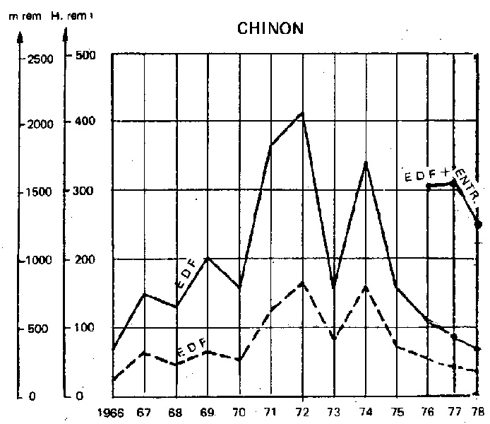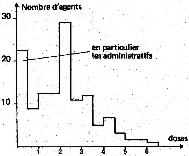 Un calcul simple laisse donc prévoir que la dose moyenne annuelle (intégrée sur dix ans) sera, pour cette population, de: Parmi cette population, certains groupes sont plus particulièrement exposés (ouvriers d'entretien mécanique par exemple). Il faudra s'attendre pour eux à des doses moyennes annuelles de l'ordre de 2,5 rem, voire 3 rem, et ceci chaque année... Ces doses sont d'ailleurs sensiblement celles qui sont enregistrées normalement à Chooz (PWR 300 MWe) depuis 1970. Nous voilà bien loin de la CIPR 26 et de la dose moyenne de 0,5 rem/an. Ceci est bien la preuve qu'une limitation sur la dose maximale bien que nécessaire, n'est pas suffisante pour limiter la dose moyenne au dixième de celle-ci. Ras-le-bol de la loi log-normale dont on nous rebat les oreilles. La courbe suivante donne d'ailleurs l'histogramme des doses enregistrées à Chooz en 1976 (dose collective totale : 286 hommes-rem pour un effectif de 134 agents): ![]() De plus en plus fort: