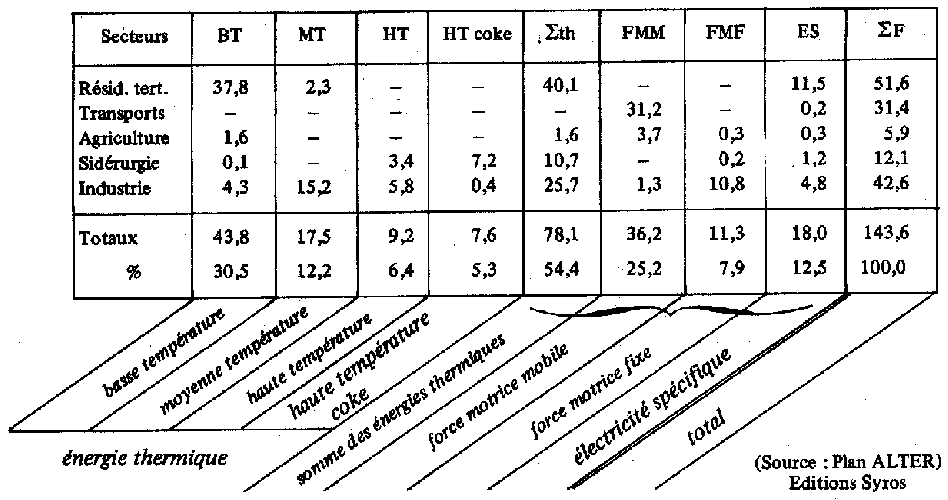Il est clair que ces tendances nouvelles dont sont issues les notions et la mise en application des économies d'énergie, de recyclage, de rationalisation des transports n'ont absolument pas été prises en compte dans l'élaboration du programme nucléaire français. Aucun scénario alternatif n'est pris en compte. Tout est basé sur l'idée de la poursuite d'une croissanoe énergétique exponentielle pour une société de gaspillage. La répartition des besoins énergétiques.