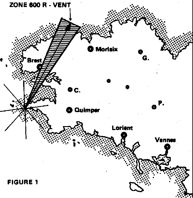 En cas d'implantation d'une centrale nucléaire, les populations comme les autorités doivent être prêtes à subir les conséquences d'un accident plus ou moins grave lié à une perte du pouvoir de refroidissement du coeur de la centrale. En ce qui concerne Three Mile Island où cet accident a été évité que de justesse, il n'a pas été possible d'éviter des rejets relativement importants de gaz radioactifs. Les dernières estimations[17] permettent d'évaluer à 3.500 Homme-Rem la dose collective reçue à proximité de la centrale. On admet, en général pour une telle dose et une telle population, l'apparition de 2 à 20 cancers supplémentaires.[18] Quel serait l'impact d'un accident majeur à Plogoff? Divers centres de recherche ont procédé à l'analyse des risques et estimé les conséquences radiologiques d'un accident grave[19]. La définition des hypothèses de calcul peut être fournie sur demande. A partir de ces données, il est possible de produire un modèle géographique de contamination permettant de définir en chaque point du territoire les zones d'irradiation et la valeur de cette irradiation (voir fig. 1). On conçoit que selon l'orientation des vents, les agglomérations de Brest, Morlaix, Ouimper, Lorient puissent être atteintes. Ce qui est également important à noter, c'est que dans l'hypothèse, non souhaitable mais réaliste d'un accident grave (perte du réfrigérant primaire et fusion du coeur), des zones entières seront contaminées par des éléments à vie moyenne ou longue, rendant ainsi impossible et pour longtemps toute vie et toute activité normale. (Les conséquences graves de réacteur nucléaire à eau légère (PWR) de 1000 MWé, d'après une étude de l'Institut de Sûreté des Réacteur: de la République Fédérale Allemande - 1976). La zone hachurée est celle où l'irradiation d'un individu, consécutive au passage du nuage radioactif est supérieure à 600 rem et peut être considérée comme mortelle. Sa largeur a été calculée à partir des valeurs de l'irradiation dans l'axe du vent figurant dans les résultats de l'étude, à l'aide des coefficients usuels (Martin-Tipvart) du dispersion du modèle gaussien de diffusion atmosphérique utilisé par l'étude. Le profil de cette zone peut être modifié par le relief. Conditions météorologique: vent de 3,6 km/h, atmosphère très stable stabilité F (conditions défavorables). Si l'on tient compte du renouvellement du combustible dans les réacteurs PWR, la largeur, mais non la longueur de cette zone doit être légèrement diminuée, elle passe de 11 km à 9,8 km à l00km du réacteur. Il est à noter par contre que le calcul a été fait en admettant un relâchement partiel et non total des produits radioactifs dans l'atmosphère et qu'il ne correspond donc pas à la pire des hypothèses. (suite)