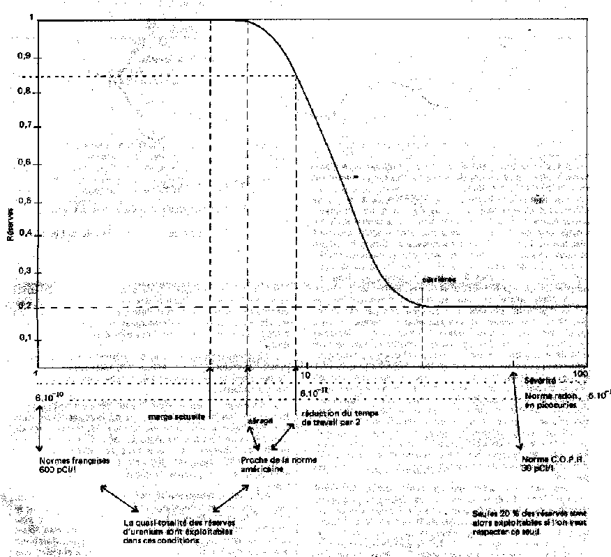 Si l'on fait le calcul par rapport aux normes CIPR, cela équivaut à 4 rem par an pour la population et 40 rem pour les travailleurs, ce qui outrepasse les principes de 1,5 et 15 rem par an respectivement. Déjà la CIPR a donc admis que l'impératif technologique et économique (grande difficulté technique et coût très important pour abaisser la teneur en radon de l'air) passait avant les nécessités de garantir la santé des personnes exposées. Mais ce n'est que le début d'une longue lutte pour rendre les normes moins sévères. Alors que l'ensemble des normes définies par la CIPR sont adoptées par tous les pays participants à cette commission, et même parfois rendues encore plus contraignantes, seules celles concernant le radon rencontrent une opposition généralisée. Les raisons de cette action entreprise contre les seuils nouvellement fixés sont claires: s'il fallait appliquer ces normes, le prix de l'uranium extrait grimperait considérablement, suite à de lourds investissements pour limiter les émanations de radon, et les niveaux maximum auraient toutes les chances d'être dépassés pour les minerais à moyenne et haute teneur. D'un commun accord, l'Agence Internationale de l'Energie Atomique, Euratom et la France décident donc de rendre les normes dix fois moins contraignantes, justifiant cet état de fait par les arguments suivants (cf. Pradel,...): «La CIPR a défini la concentration maximale admissible (C.M.A.) pour le radon de la façon suivante: f étant la fraction en activité des ions de radium A (c'est-à-dire le polonium 218) non attachés à des aérosols. Cette norme a été établie à la suite de travaux théoriques et expérimentaux sur l'efficacité de la rétention des particules par l'appareil broncho-pulmonaire, qui avaient montré notamment, l'importance de la contribution des particules ultrafines. Ayant adopté pour f la valeur de 0,1, la C.M.A. recommandée par la CIPR est donc de 30 pCi/l» p.15