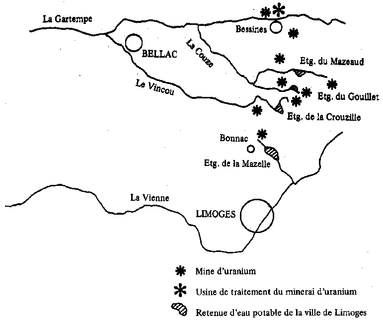 La plus grande partie de l'uranium français provient actuellement de la région de Limoges; ce qui s'y passe est particulièrement intéressant. Les minerais extraits par la COGEMA dans les Monts d'Ambazac contiennent, outre de l'uranium, de nombreux autres éléments radioactifs qui font partie de la chaîne de désintégration de l'uranium, mais qui sont jusqu'à plusieurs dizaines de fois plus toxiques que celui-ci. Citons le radium et deux thorium, qui ont des propriétés chimiques semblables à celles du calcium et se fixent sur les os après ingestion; plusieurs isotopes de polonium, plomb et bismuth du protactinium et un gaz qui se dissout dans l'eau, le radon. A l'état naturel, certaines sources qui traversent les gisements d'uranium peuvent être contaminées par ces radioéléments, et se révéler dangereuses pour les populations qui les utilisent. De récentes études sur l'impact des faibles doses de radioactivité confirment cette hypothèse. Les services d'hygiène, qui ont des instructions précises en la matière, ne semblent pas porter toute l'attention nécessaire pour maîtriser ces problèmes. Heureusement peu de gens sont concernés. Cette pollution est en effet limitée, sinon il y aurait belle lurette que l'uranium déposé ici depuis plusieurs dizaines de millions d'années, et qui est l'élément pratiquement le plus soluble, serait parti dans les eaux, direction l'Atlantique. Il en est tout autrement lorsque l'on brise le minerai, qu'on l'extrait, le concasse, puis le traite. Toutes ces opérations ont lieu en présence d'eau, qui va d'autant plus aisément dissoudre les éléments radioactifs que le minerai sera partagé. Les eaux particulièrement agressives (acides) du Limousin entraînent facilement les 13 radioéléments principaux contenus dans le minerai. Seuls trois d'entre eux sont contrôlés par le S.C.P.R.I. (2 isotopes de l'uranium et le radium). Pour les autres (thorium, protactinium, radon, polonium, plomb... notamment), le S.C.P.R.I. ne semble pas estimer nécessaire de rechercher leur existence. Seules des mesures de radioactivité bêta sont faites (nous ne les avons pas interprétées ici par manque de temps). Les mesures de radioactivité alpha, exécutées uniquement sur les eaux potables de Limoges, ont été stoppées au moment où elles atteignaient leur maximum fin 1975 (voir les courbes en annexe). Le système de contrôle choisi pour les mesures alpha et bêta pourraient d'ailleurs sous-estimer de beaucoup les taux de pollution, car il semble bien que le radon et une partie de ses descendants à vie courte soient éliminés lors de la phase de mesure. Les contrôles du SCPRI sur un certain nombre d'eaux de la région permettent de tirer les indications suivantes: - le Vincou: rivière qui se jette dans l'étang de la Crouzille après avoir reçu les effluents des mines du Fanay et des anciennes mines de Sagnes et d'Henriette. (suite)