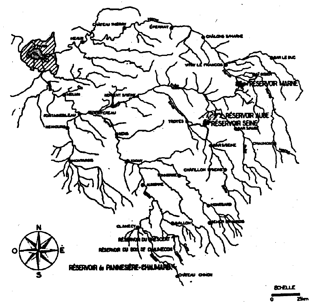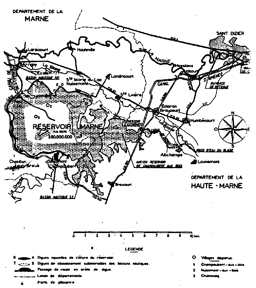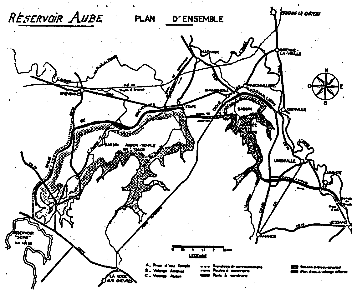 b) en période de crue: le réservoir permet de prélever en Seine les 2/3 du débit maximum connu à la prise d'eau, soit 180 m3/sec. et d'agir efficacement sur l'écrêtement des crues. Troyes est pratiquement à l'abri des inondations et à Paris, avec une crue identique à celle de 1955, la hauteur des eaux serait réduite de 0,50 mètres. 2. Barrage-réservoir Marne