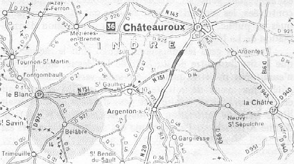 Malvy, jeune débutant débarquant dans la galère, pris de court, a dû utiliser une des techniques de décision qui semble en usage à l'Industrie, lorsque le corps des Mines laisse la liberté de choix au Ministre, le jeu de fléchettes. La carte de France de l'almanach des PTT à deux mètres et hop, c'est décidé. En fait. en raison des restrictions budgétaires, il ne devait y avoir que deux fléchettes, car si je ne m'abuse, le département de l'Indre a bénéficié du piston de son député PS. Ne soyez pas jaloux, il y a quelques années, pour la centrale de Civaux les Poitevins eurent droit à l'entregent de Monory. Le coup d'envoi est donné: l'Indre, la Vienne et l'Aube sont les heureux préprospectés. On va faire un tour de département. L'INDRE ![]()
