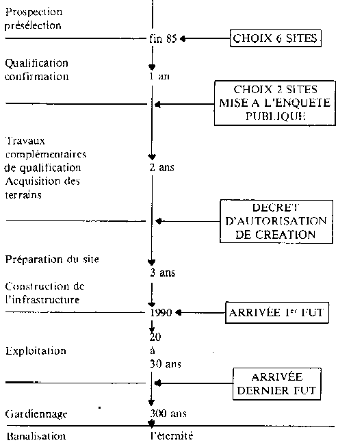 1984. Dans un discours de juin 84, Auroux décrivant la nouvelle règle fondamentale de sûreté relative aux centres de stockage en surface, précise les critères d'acceptation des colis: «l'activité en éléments radioactifs émetteurs alpha d'un colis accueilli dans un centre de surface ne devra pas...» Dans la règle fondamentale de sûreté, nos technocrates ont écrit: «l'activité massique moyenne en émetteur alpha de chaque colis de déchets (en prenant toujours la valeur qui sera obtenue à l'issue de la phase de surveillance).. Donc pour les mêmes valeurs réglementaires, pour Auroux, c'est à la livraison du colis, pour le SCSIN c'est après 30 ans de décroissance. Cela permet d'en mettre un peu plus, en tenant compte de la décroissance. Mais pour des émetteurs de très longue période, c'est vraiment très peu. Bande de gagne-petit!!! A cette occasion il nous avait décrit les grandes phases de la mise en oeuvre des futurs sites de stockage de surface de déchets nucléaires (catégorie A: faible activité, contamination alpha inférieure à 0,01 curie par tonne) et du laboratoire souterrain destiné à tester les qualités du milieu pour le stockage des déchets des catégories B et C (moyenne et haute activité contaminés alpha). La suite fut le communiqué de presse du Secrétariat d 'fEtat à l'Energie du 21 septembre 1984 (voir encadré à droite) où nous apprenions, avec la joie que vous devinez les noms des trois départements choisis pour les sites de surface. A ce moment-là tout alla très vite. L'ANDRA, aidé par les préfets organisa des réunions avec les élus locaux, mit en place un permanent chargé de diffuser la bonne parole. Après ce blitz, les populations commencèrent à réagir et la guerre de tranchées s'installa dans nos campagnes. (suite)