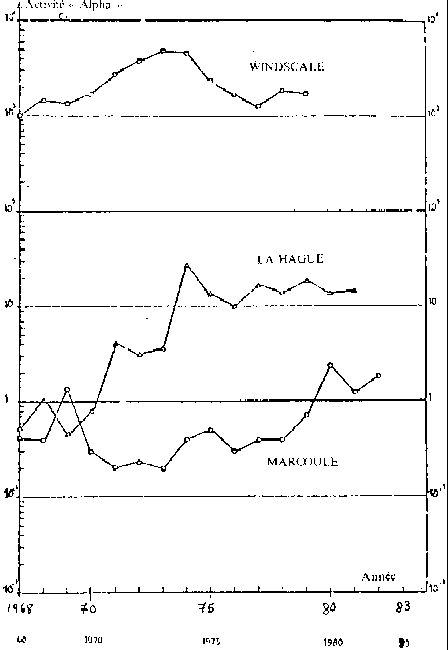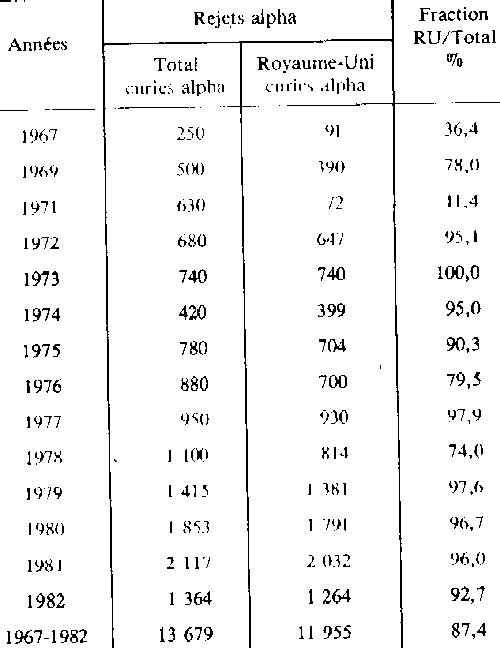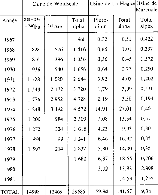 Rejets annuels d'effluents liquides radioactifs Activités en curies NOTA: On trouvera les données relatives aux activités bêta et gamma des effluents liquides de Windscale et de La Hague dans /ANC79/, /GER79/, /CFD8O/, /TAY82/, /W0082/ et /CAS82/, Annexe 7. Les différentes publications ne donnent pas toujours des valeurs de rejets concordantes en tous points. Le tableau suivant donne les activités «alpha» des déchets non conditionnés de l'Usine de Windscale /FL076/, page 139: Déchets non conditionnés stockés à Windscale ![]() L'activité alpha totale des déchets