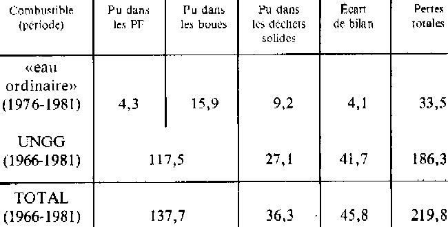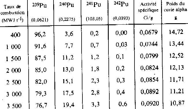 Nota: Valeurs entre parenthèses: activité spécifique de l'isotope en Ci.g-1. Nous pouvons valablement supposer que le plutonium rejeté avant 1967 provenait du retraitement de combustible ayant un taux de combustion moyen compris entre 1.000 et 2.000 MWjt-1 (poids du curie alpha:12,13 à 13,44 g). p.18