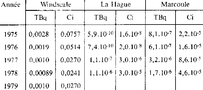 Le poids du plutonium contenu dans les déchets solides immergés par le Royaume-Uni est donné dans le tableau suivant: Plutonium immergé par le Royaume-Uni 1949-77 ~ 10.500 127 à 141 1978-82 ~ 7.900 86 à 96 1949-82 ~ 18.400 213 à 237 Si l'on applique les mêmes hypothèses à l'ensemble des déchets solides immergés entre 1967 et 1982 sous l'égide de l'AEN, on obtient masse de plutonium rejetée: 149 à 167 kg. 3.3. Les rejets d'effluents liquides et gazeux Les effluents gazeux des usines de retraitement du combustible sont, exception faite des situations accidentelles, très faiblement chargés en plutonium comme le montrent les rejets annuels des usines de Windscale, La Hague et Marcoule /UNS82/, page 317: Rejets radioactifs gazeux des usines de retraitement ![]() Les rejets annuels d'eftluents liquides radioactifs