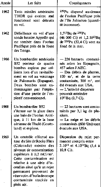 L'activité du plutonium-238 - 17.000 Ci - soit environ 1 kg - ainsi libérée est supérieure à celle résultant des essais nucléaires aériens (6,3. l014Bq au lieu de 3,3.l014Bq). Parmi les autres accidents, on notera brièvement /CFD8O/, /AEN81/: Le plutonium dispersé lors d'accidents ou d'incidents III. Le plutonium dans les activités industrielles Le plutonium comme l'ensemble des transuraniens