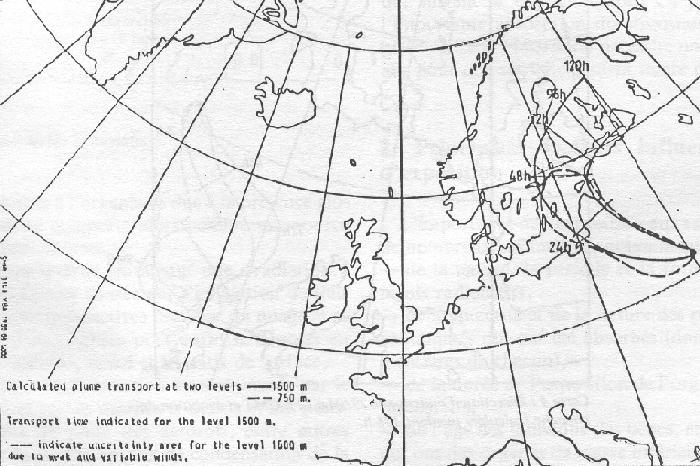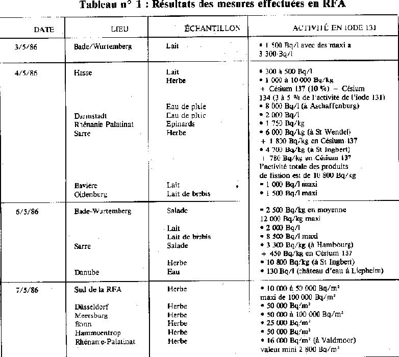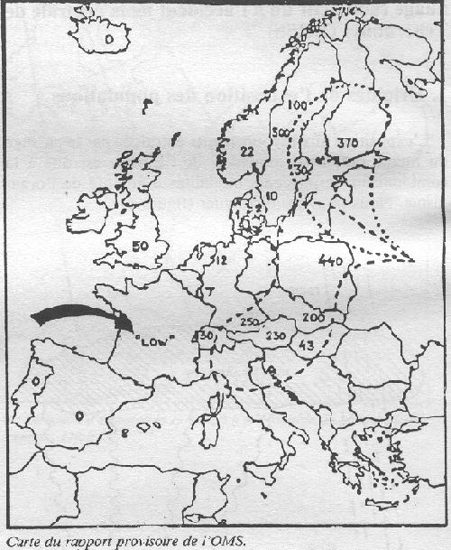 Des mesures effectuées avant et après lavage à l'eau, par des physiciens du CNRS de Strasbourg, ont montré que le lavage à l'eau, non additionnée d'un produit détergent, était inopérant du point de vue de la décontamination. Les résultats des mesures effectuées en Allemagne sur des échantillons de lait, d'herbe et d'eau de pluie sont donnés dans le tableau no 1. Une série de mesures résultant d'analyses effectuées par le Service de Radioprotection du Centre de Saclay, est donnée dans les tableaux no 2 pour l'herbe -, no 3 pour le lait -, no 4 pour l'air -. Ces valeurs sont proches des valeurs moyennes françaises si l'on considère l'ensemble des résultats collectés et analysés[8] par l'Institut de Protection et de Sûreté Nucléaire - IPSN -. Carte du rapport provisoire de l'OMS 5. Les «seuils d'intervention»