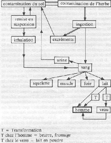 4) la contamination interne due à l'ingestion de radioéléments issus du dépôt radioactif en surface (produits agricoles, eaux de ville, etc...). Le transit des produits radioactifs jusqu'à l'homme est souvent complexe comme l'illustre la figure 2 pour le lait de vache: T = Transformation