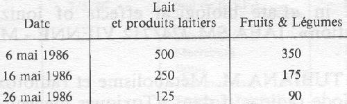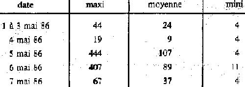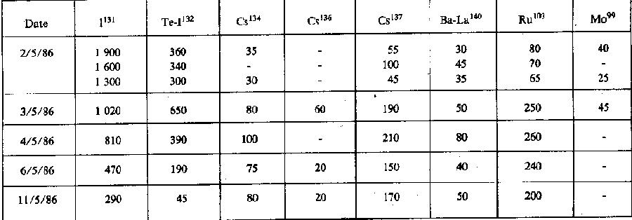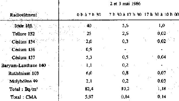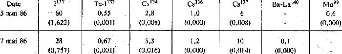 · L'activité volumique totale représente 1,64 CMA (5/5/86)et 0,79 CMA (7/5/86). La teneur en strontium 90 n'a pas été mesurée. (suite)