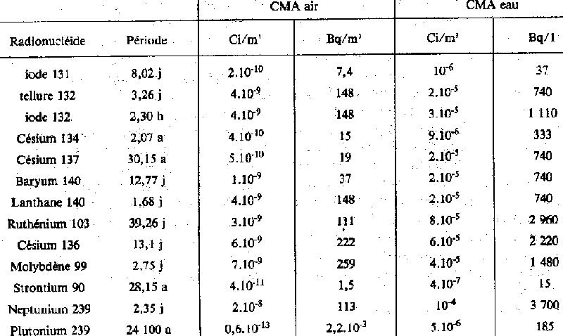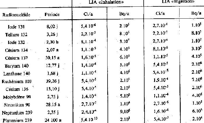 Pourtant l'ingestion d'un seul litre de lait contaminé par de l'iode 131 à 2.000 Bq/l entraîne, chez un jeune enfant, un équivalent de dose effective de 40 mrem[2]. Il lui suffira donc de consommer 12,5 litres de lait pour atteindre la limite maximale annuelle de 500 mrem fixée par la Réglementation Française (décret du 16 juin 1966). Il est par ailleurs nécessaire de préciser les niveaux de doses occasionnés à la thyroïde par l'ingestion d'un litre de lait contaminé par de l'iode 131 à 2.000 Bq/l: - pour un adulte: 100 mrem - pour un enfant d'un an: 2.000 mrem. La limite maximale admissible pour la thyroïde étant de 5.000 mrem pour les personnes du public, on notera qu'elle sera atteinte pour un enfant d'un an après avoir consommé 2,5 litres de lait. Limites conjoncturelles fixées par la CEE
