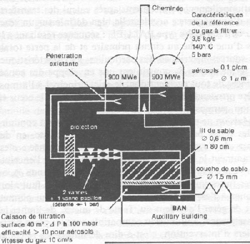 A l'exception de U1, ces procédures visent non à prévenir l'accident, mais à en atténuer la gravité. A ce titre, un bon exemple est la procédure U5 visant à décomprimer l'enceinte à travers un système de filtration «rustique» en cas de montée en pression dangereuse à l'intérieur du bâtiment du réacteur. Parmi les modes de ruine de l'enceinte prévus dans le rapport RASMUSSEN, le mode d, correspondant à une perte du confinement par augmentation de pression, est l'un des moins improbables. En cas d'attaque du radier par le coeur en fusion et de perte simultanée des moyens de refroidissement interne de l'enceinte, les études montrent que la pression croîtra régulièrement jusqu'à atteindre, au bout d'un jour à quelques jours, une valeur au-delà de laquelle l'étanchéité de l'enceinte n'est pas garantie. Cette montée en pression est liée à la formation de gaz incondensables (CO et CO2 essentiellement) provenant de la décomposition du béton du radier par le combustible fondu. C'est un processus relativement lent donnant un préavis de 12 à 24 heures ou davantage avant de dépasser une pression incompatible avec un maintien suffisant de l'étanchéité de l'enceinte. Face à une telle situation de menace grandissante de rejets radioactifs majeurs par perte de l'étanchéité de l'enceinte, il serait très regrettable de ne disposer d'aucune mesure pour parer ou réduire la menace. Partant de la constatation qu'un gain d'un facteur 10 environ serait suffisant pour ramener le niveau des rejets radioactifs de S2 à S3, c'est-à-dire à un niveau compatible avec les PPI, EDF en agrément avec les autorités de sûreté a conçu et étudié en liaison avec l'I.P.S.N. un système de filtration simple reposant sur la filtration des aérosols à travers un lit de sable [5]. Le dispositif retenu met à profit une traversée existante de l'enceinte de confinement, prévue pour la décompression après l'épreuve de l'enceinte. Cette traversée sera équipée de 2 vannes extérieures, manoeuvrables sous 5 bars et commandées de l'extérieur. Une détente du gaz, ramenée à la pression atmosphérique, est assurée entre l'enceinte et le caisson de filtration qui évacue dans la cheminée prévue pour les effluents gazeux. Des essais de la laboratoire effectués à l'IPSN au Centre de Cadarache ont permis de caractériser le type et la granulométrie du sable et ses performances vis-à-vis d'aérosols qui ont été simulés, en fonction de la température, pression et humidité, en régime permanent et transitoire [6]. Le compromis entre efficacité de filtration et perte de charge limitée a conduit à retenir un sable de 0,6 mm de diamètre, traversé de haut en bas sur une épaisseur de 80 cm à une vitesse de 10 cm/s (perte de charge 0,1 bar). La section de filtration est de 40 m2 et le débit 3,5 kg/s. Les essais concluants ont conduit EDF à proposer la mise de ce système sur tous les réacteurs à eau sous pression du parc français, le caisson de filtration devant être installé sur le toit du bâtiment des auxiliaires nucléaires des réacteurs déjà construits. 5. G. Beraud, J. Chapuis. J. Delalande : Présentation du systéme de décompression - filtration de l'enceinte de confinement, AIEA-SM281/37, Columbus Symposium, Oct. 1985 6. A. L'Homme, M. Berlin, G. Beraud : Résultat des essais de laboratoire sur la filtration rustique, Luxembourg meeting, October 14-l8th, 1985 p.6