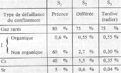 1) Plus les événements sont improbables, plus grande est l'incertitude sur le calcul de leur probabilité, de sorte que ce calcul lui-même n'a plus grande signification 2) Mais surtout le calcul de termes sources dans de tels accidents laisse de côté le problème majeur que constitue la recherche de la maîtrise du déroulement de ces accidents par une série d'actions appropriées, ce qui est au contraire le souci principal des responsables français. En France nous n'accordons guère de crédit aux calculs probabilistes pour classer les accidents graves, car nous estimons que l'estimation de ces valeurs très faibles ne repose pas sur une assise scientifique suffisante. Nous préférons nous en tenir à la notion d'événement «concevable» ou «plausible» au sens du jugement de l'ingénieur. Quant à l'expression «terme source» nous ne l'utilisons qu'avec beaucoup de prudence, car elle nous paraît ambiguë pour les raisons développées ci-dessus. Ne faut-il pas associer à la notion de «terme source» celle des objectifs visés: ainsi l'adéquation des plans d'urgence vis-à-vis des populations? Précisons donc dans notre vocabulaire l'expression «terme source» sera utilisée dans un sens restrictif : «un terme source est un rejet typique, caractéristique d'une famille de réacteurs et représentatif d'une classe d'accidents; il est considéré pour définir les actions correctrices à prévoir vis-à-vis de cette classe d'accidents en vue de la protection ultime des populations». Ainsi la notion de terme source est-elle associée à une classe de rejets et en l'absence d'actions correctrices, dans le cadre de la préparation des plans d'urgence (Plan d'Urgence Interne de la centrale et Plan Particulier d'Intervention à l'extérieur du site - PPI). A la suite des études menées sur les REP de conception française, trois termes sources de référence ont été identifiés, correspondant à trois grandes catégories d'accidents comportant toutes la fusion complète du coeur. Dans l'ordre de gravité décroissante: - le terme source S1 pour des accidents entraînant la rupture précoce de l'enceinte de confinement (quelques heures après le début de l'accident); un exemple type de ces accidents est le «mode a» selon la terminologie du rapport WASH-1400 - le terme source S2 pour des accidents conduisant à des rejets hors enceinte directs à l'atmosphère à la suite d'une perte d'étanchéité différée, après un délai d'un ou de plusieurs jours (exemple: mode d) - le terme source S3 pour des accidents conduisant à des rejets indirects, du fait de l'existence de voies de transfert avec rétention entre l'enceinte et l'atmosphère extérieure (exemple mode e). Les niveaux de rejets correspondants ont été évalués sur la base des connaissances utilisées dans le rapport WASH1400. Ils sont respectivement, pour ces trois termes sources, de quelques dizaines de pour cent, de quelques pour cent et de quelques pour mille du contenu du coeur en produits de fission pour les produits volatifs, hormis les gaz rares relâchés dans leur quasi totalité dans les trois cas: 4. APS: cf. supra (suite)