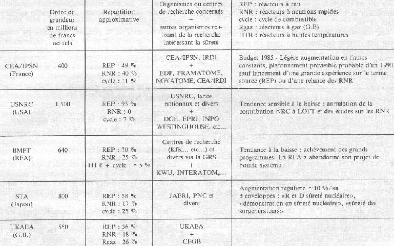 Il est difficile de cerner de façon homogène et cohérente, pour les pays cités, la part de recherche qui relève de la sûreté et de la distinguer de celle qui s'apparente au développement des technologies nucléaires. Afin de permettre néanmoins une certaine appréciation des efforts budgétaires consentis, le parti suivant a été adopté: on se limitera à la comparaison des dépenses globales des organismes officiels des principaux pays, à l'ordre de grandeur des budgets moyens de ces dernières années (les fluctuations n'étant pas toujours très significatives), à la mention de la tendance d'évolution actuellement perçue; enfin on indiquera la répartition déclarée ou estimée entre réacteurs à eau, réacteurs à neutrons rapides et le reste (incluant les autres types de réacteurs, le cycle du combustible, et quelquefois des «études générales»). On aboutit ainsi au tableau I ci-après qui est à considérer, compte tenu de ces réserves, avec beaucoup de prudence. En particulier, du fait de la limitation aux organismes désignés, les chiffres ne donnent pas forcément l'image de l'effort réalisé dans l'ensemble de chacun des pays. De plus, la variation importante des taux de change au cours de ces dernières années peut fausser les comparaisons. Enfin des ajustements approximatifs ont dû être effectués dans certains cas quand les budgets sont donnés hors frais de main d'oeuvre et de support général, les chiffres retenus étant censés englober ces postes. Les sources proviennent soit de publications concernant des budgets gouvernementaux récents (généralement globaux mais pas toujours complets sur la ligne «sûreté») ou des sommes dépensées par des centres de recherche, soit sur des chiffres partiels communiqués par l'Agence Internationale de l'Energie. Des interprétations et recoupements ont été faits pour les Etats-Unis, l'Allemagne Fédérale et le Japon, avec l'aide des attachés nucléaires. (suite)