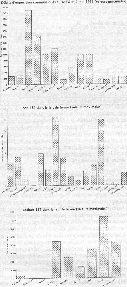 Une évaluation globale de l'impact des retombées de Tchernobyl laisse prévoir que la dose supplémentaire de rayonnement qui en résultera sera du même ordre que celle du rayonnement naturel annuel. (c'est le Wbmst. qui souligne) On estime actuellement à plusieurs centaines de millions de DMarks les pertes occasionnées en République fédérale, notamment par la destruction et la confiscation de denrées alimentaires et par les restrictions imposées à la production alimentaire. Les pouvoirs publics sont entrain d'étudier les compensations à verser à ceux qui ont subi des pertes financières. Compte tenu de l'information disponible à ce jour au sujet de l'accident de Tchernobyl, les autorités fédérales ont entrepris une évaluation de la sûreté des centrales nucléaires du pays. La première enquête, achevée en juin dernier, a montré qu'il n'y avait lieu de prendre aucune mesure de sûreté complémentaire dans les centrales en service ou en construction. D'après les renseignements dont on dispose, le site de Tchernobyl n'a été le siège d'aucun phénomène ou événement nouveau. Aussi peut-on dire que les sécurités incorporées, l'excellent dossier d'exploitation et les résultats de la recherche sur la sûreté des réacteurs confirment la solidité du concept de sûreté des réacteurs appliqué en République fédérale. D'une façon générale, il n'est besoin ni de précautions supplémentaires, ni de nouvelles recherches en la matière. Toutefois, l'accident pourrait inciter à pousser plus avant l'étude de la prévention des accidents et des moyens de limiter leurs conséquences. Extrait du rapport français (pages 53-54)