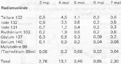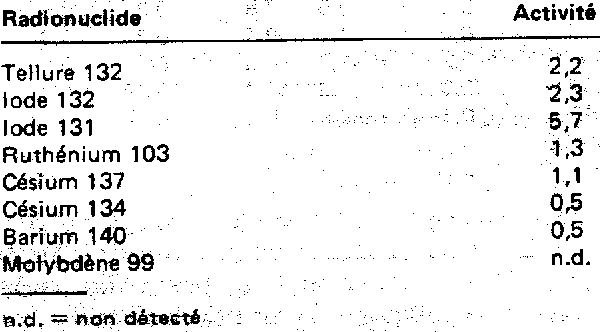 * ont été trouvée porteuses aussi de zirconium 95, niobium 95, cérium 141 et cérium 1444 présentant des activités respectives de 116, 122, 38 et 94 Bq/kg (suite)