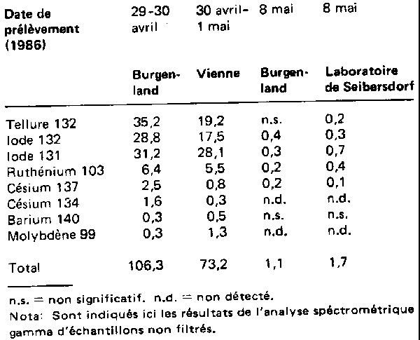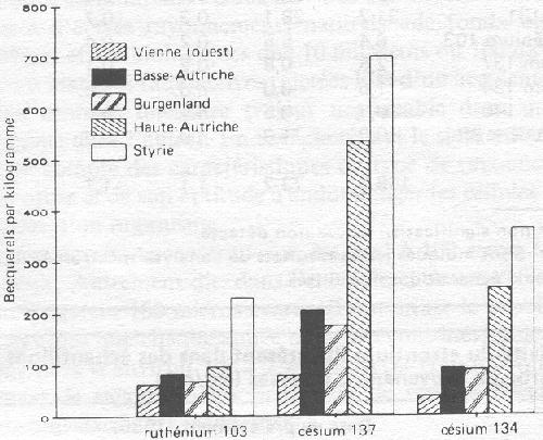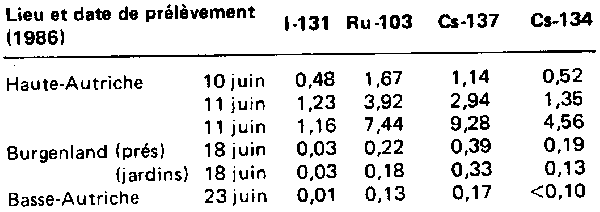 En Autriche, l'activité tolérable maximale du césium 134/césium 137 dans les fruits frais est fixée à 111 Bq/kg (3 nanocuries par kilogramme), limite dépassée par 80% des échantillons analysés. Toutefois, le nettoyage et le lavage des fruits a eu pour effet d'en ramener l'activité à des valeurs voisines du niveau tolérable ou même inférieures, et ce pour presque tous les échantillons (voir figures). Cette réduction a atteint 30% pour le césium 134/césium 137 et 75% pour le ruthénium 103. Dans le jus obtenu à partir des mêmes fruits, l'activité du césium est tombée à 20% de sa valeur initiale et celle du ruthénium a pratiquement disparu. On n'a trouvé aucune radioactivité artificielle dans les champignons de couche. Les champignons des champs, pur ou mélangés aux premiers, contenaient surtout du césium 137, dont la radioactivité variait de 6 à 139 Bq/kg. Là encore, le nettoyage et le lavage ont sensiblement abaissé la radioactivité. Vu le temps écoulé entre l'accident et les analyses, aucun de ces échantillons ne présentait d'iode 131 (dont la période est de 8.05 jours). Radioactivité d'un échantillon de sol superficiel prélevé