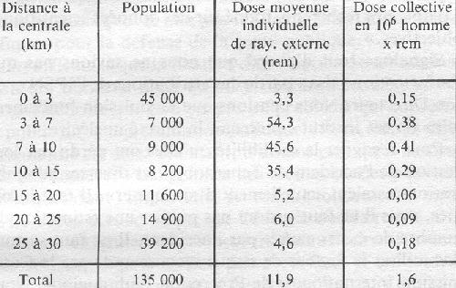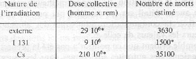 Nous avons résumé l'ensemble de leurs estimations dans le tableau suivant qui concerne la population d'Ukraine et de Biélorussie (75 millions d'habitants): Le total des morts dans les 50 ans à venir serait de l'ordre de 40.000. Il faut ajouter que les Soviétiques indiquent qu'ils n'ont pas tenu compte du Strontium 90. En effet, il n'est pas possible de calculer dès maintenant le cycle du Strontium, plus lent que celui du Césium. D'autre part les données manquent pour le Strontium. Mais il est possible, toujours d'après les experts soviétiques, que dans quelques années le Strontium soit une composante non négligeable de la contamination radioactive*. Le Ruthénium 106 et le Cérium 144 ont été négligés. Ces radioéléments ne donneraient qu'un effet dû à la contamination surfacique des végétaux (à court terme). L'absorption par les racines ne représenterait que 10 à 20% de la quantité déposée de ces éléments. Il est difficile de savoir si cette procédure est totalement justifiée car il y a peu d'informations concernant ce problème. Pour les 75 millions d'habitants considérés, la dose moyenne individuelle efficace (au sens de la CIPR) est de 3,3 rem. Il serait assez étonnant que la dose efficace pour les 205 millions de Soviétiques qui vivent hors d'Ukraine et de Biélorussie tombe brutalement à zéro ! Même si la dose est plus faible, comme elle affecte une population 2,7 fois plus élevée, l'effet existe et peut ne pas être négligeable. Enfin signalons qu'évidemment le rapport soviétique ne donne pas d'évaluation de l'effet de la catastrophe sur le reste de l'Europe (hors URSS) ce qui concerne 490 millions de personnes. Les experts soviétiques ont négligé plusieurs composantes dans leur évaluation des doses collectives qui ont résulté de la catastrophe. Il est évident que les problèmes posés par une contamination de ce type sont considérables et qu'il y a de nombreux points très mal connus. D'une façon générale le rapport soviétique est assez remarquable, surtout si l'on prend en compte qu'il était destiné à une très large diffusion. Nous n'avons aucune raison de suspecter les Soviétiques d'avoir surestimé les effets de la catastrophe. Si nous pensons que leur évaluation est sous-estimée c'est à partir des renseignements que nous avons pu trouver dans leur rapport. * La préoccupation actuelle des russes est le plutonium. Une quantité non négligeable est partie dans le nuage en très fines particules et est difficile à déceler. p.23