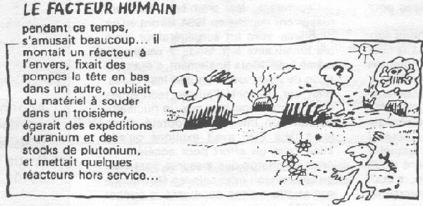 Il y avait bien eu Seveso et Three Mile lsland (TMI); mais après un moment de panique, les officiels se sont repris. Pour Séveso, si vous les interrogez, aujourd'hui ils vous expliquent qu'il n'y a eu aucun effet, que les chloroses devaient relever de la psychopathologie. Pour TMI, l'affaire fut plus chaude. En effet, il s'agissait cette fois du nucléaire et les populations le craignent bien plus que la chimie - peut-être à tort - mais sûrement par habitude de l'industrie chimique qui a plus de 100 ans de mauvais et bons services (!) Cependant, nos oracles ont pu se répandre en messages rassurants: «Il n'est rien sorti, il n 'y a pas eu d'effets». Ils avaient beau jeu puisqu'à défaut de mesures incontestables, les détecteurs de routine ayant non ou mal fonctionné, ils s'appuyaient sur leurs propres modélisations des rejets. Gageons que comme pour le Nevada, à la suite des tirs nucléaires de 1957, où 20 ans après on a vu se développer des cancers, TMI nous fera peut-être des surprises pour l'an 2000. Par contre, TMI a touché un point sensible: le fric. Une tranche nucléaire hors service pour on ne sait combien d'années, voire même définitivement, de toute façon des frais de décontamination gigantesques, cela fait réfléchir. Et tous nos technocrates de gamberger sur les enseignements que pouvait apporter un accident, au cours duquel le coeur d'un réacteur à eau légère (REP) avait en grande partie fondu, s'était effondré (80 % du coeur grossièrement). Pour la mise en oeuvre de ces enseignements, c'était bien sûr sans compter avec l'inertie d'EDF et son génie pour trainer les pieds. (suite)