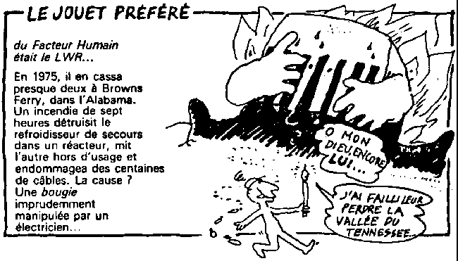 Nous suggérons d'ailleurs que ce H6 serve éventuellement à échanger les emplacements de rejets d'eau chaude et de prise d'eau froide. Notre charmant réacteur réchaufferait lui-même son eau. Soyons juste, on ne peut reprocher à EDF ce qui se passe: après tout elle n'avait pas prévu le gel en hiver, elle avait seulement pensé aux inondations. Trêve de plaisanterie. On est passé pas très loin de problèmes graves, à cause, une fois de plus de la manie d'EDF, d'écrire des papiers au lieu de passer aux actes. On sait depuis 10 ans que le gazoil gèle en hiver sur les sites de réacteurs (on a eu la grande panne de 79 et son rapport), et on vient seulement de décider d'utiliser du gazoil incongelable jusqu'a - 18oC (l'armée en a elle depuis toujours, j'espère d'ailleurs, ou qu'elle compte aller jusqu'en URSS, qu'elle en a qui va jusque - 50oC, sinon on aura une Bérésina de plus !). On analysera tout ça dans la prochaine Gazette. Alors à bientôt et bonne lecture. p.1