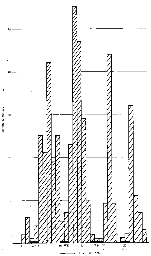 Le SCPRI n'a qu'une station de contrôle en Corse à Ajaccio. Compte tenu des dimensions de la Corse et de la diversité de ses régions, il est évident que ceci est totalement insuffisant. Personne ne semble s'être préoccupé de cette situation aberrante. Pour l'analyse des bulletins mensuels, nous suivrons la classification du SCPRI. MAI 1986 1. Poussières prélevées à 1.200 m.