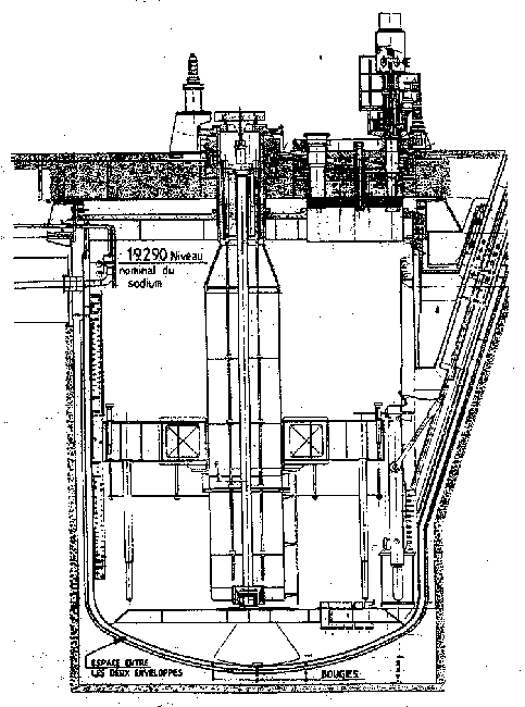 5.2. L'incident Dans le courant du mois de mars 1987 les alarmes reliées aux quatre dispositifs de détection installés dans l'espace intercuves se sont successivement déclenchées, annonçant de ce fait la présence de sodium. Un bilan des masses et niveaux de sodium confirmait cette hypothèse. Ce sodium, outre qu'il n'est pas radioactif, ne peut pas brûler car la zone de rétention est remplie d'azote. La sûreté du réacteur n'étant pas concernée par cet incident, la production d'énergie n'a pas été interrompue. Actuellement à l'intérieur du barillet, il y a environ 300 faux assemblages (maquettes en acier utilisées pendant les essais) et une dizaine d'assemblages combustibles dont certains ont été utilisés au cours des essais neutroniques: leur puissance résiduelle est très faible (moins de 100W pour le plus irradié). 5.3. Les investigations Les premières recherches ont été orientées vers les points singuliers de la cuve constitués par: - la traversée de deux tuyauteries en partie haute de la cuve; - le raccordement du «bec de cafetière» à la cuve. Les examens par endoscope et caméra de télévision de ces points n'ont pas révélé de défauts dans ces zones. D'autre part, par actions sur les niveaux de sodium dans la cuve et les pressions gaz dans la cuve de l'intercuve, on a pu localiser la fuite dans la partie basse de la cuve. L'opacité du sodium et son confinement en gaz neutre rendent très malaisée la localisation précise du défaut; l'intervention pour réparation passe par une série d'opérations préalables (vidange totale des capacités; conservation des surfaces pouvant être sensibles à la corrosion caustique...). 6 - Conclusion