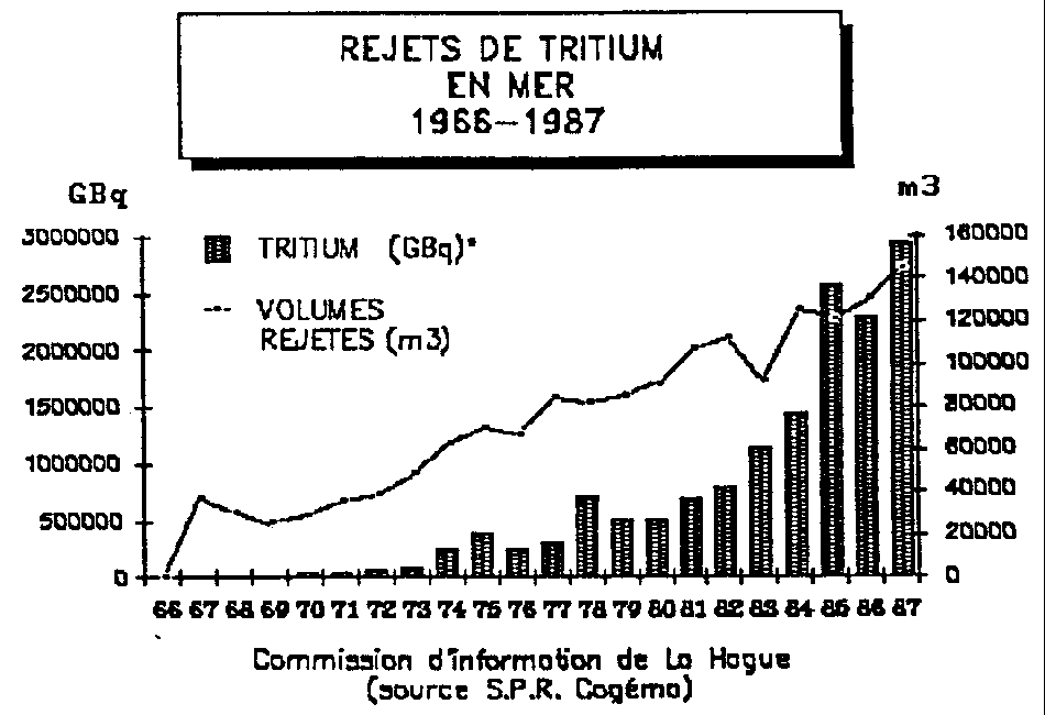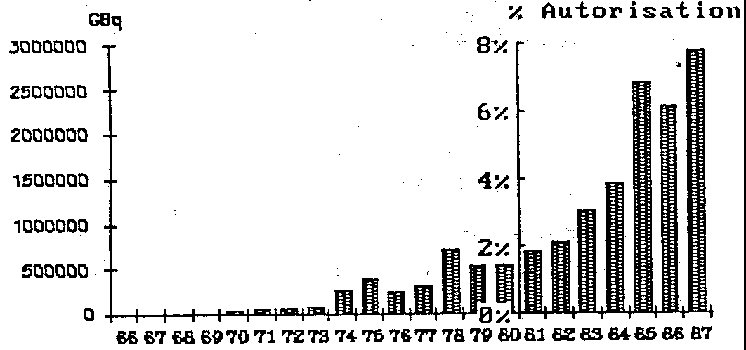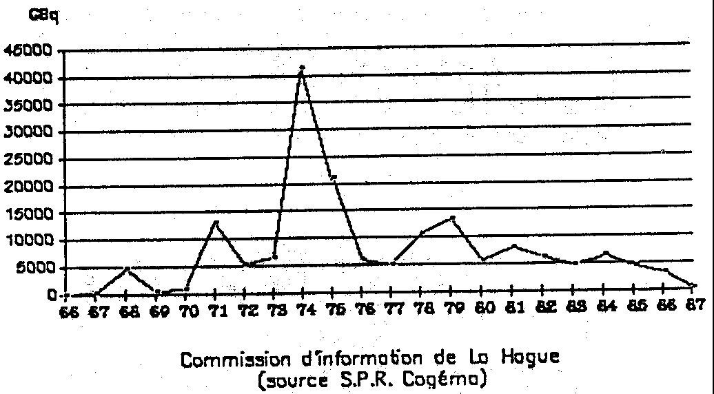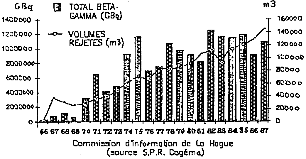 On note une relative stabilité de ces rejets depuis 1975 avec une tendance croissante depuis 1966. Comme pour les rejets b, g, on remarque une diminution récente malgré une augmentation des volumes résiduels rejetés. Ils représentent actuellement entre 20 et 40% de l'autorisation annuelle.