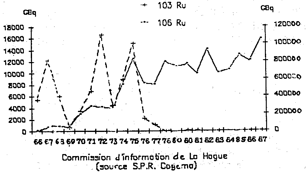 Radionucléide naturel, sa réserve planétaire a subi une très grande augmentation du fait de l'utilisation de l'énergie nucléaire à un stade industriel (réf. (1) page 138). La plus grande partie du Tritium artificiel est d'origine militaire (explosions nucléaires atmosphériques avant 1970). Compte tenu de sa période (12,3 ans), plus de la moitié de ce Tritium a disparu à l'heure actuelle. Dans les combustibles nucléaires, le Tritium apparaît par fission ternaire et par réactions d'activation avec divers éléments (lithium, bore). Il est libéré au cours des opérations de retraitement et, comme il est un composant obligatoire de l'eau des solutions, il se retrouve en quasi-totalité dans les effluents liquides sous forme d'eau tritiée (en 1987, 15 000 GBq de Tritium gazeux ont été relâchés contre 3 000 000 GBq d'eau tritiée). En l'état actuel de la technologie, la part de Tritium rejetée dans l'environnement représente 30 à 50 % du Tritium présent dans le combustible (réf. (3) page 183). Le rejet de Tritium dans les effluents liquides n'a été mesuré qu'à partir de l'année 1970. On voit que l'activité rejetée a été multipliée par six depuis les années 1970 mais qu'elle ne représente actuellement que 8 % de l'autorisation annuelle. Ruthénium-Rhodium 103 et 106 106 Ru-Rh = 1 an Les isotopes radioactifs du Ruthénium sont des produits de fission représentant, après un an, 2 à 3% des produits de fission du combustible. (suite)