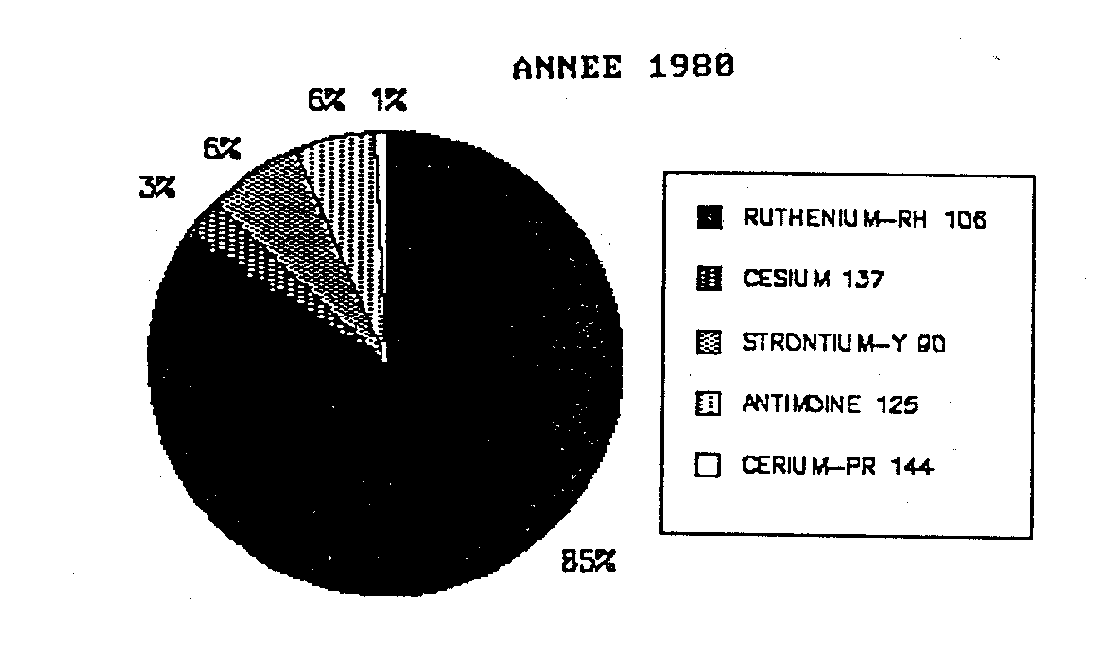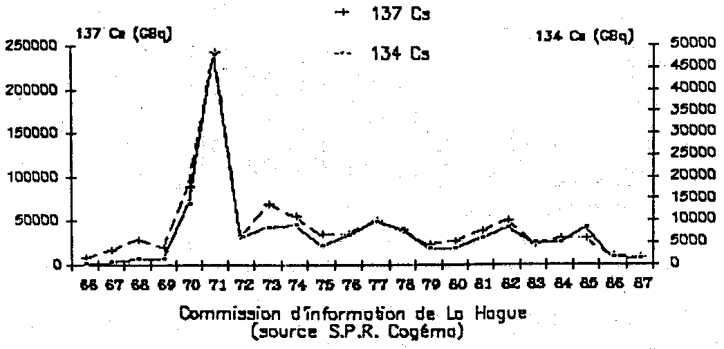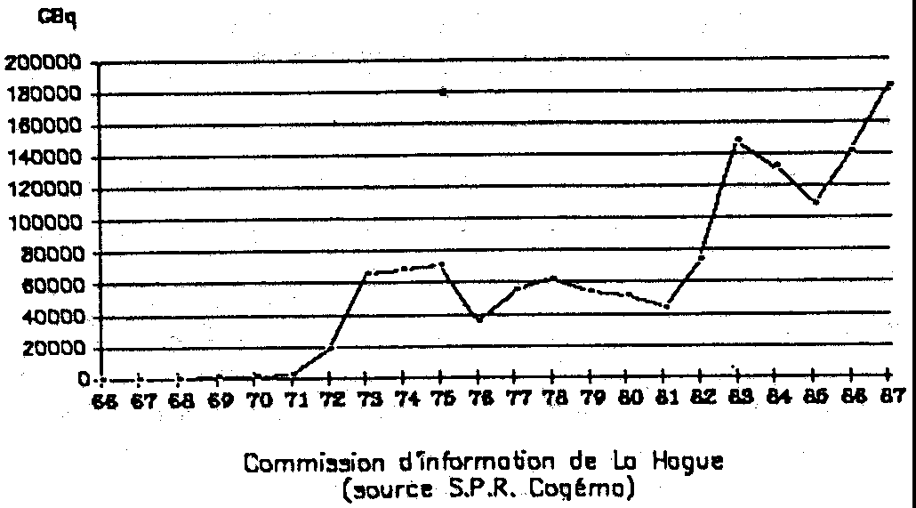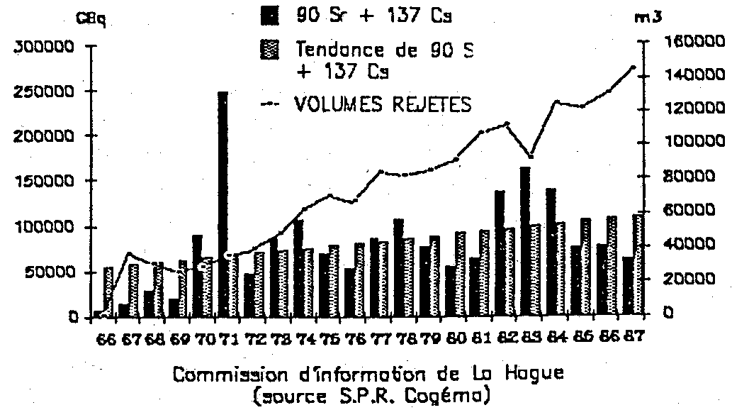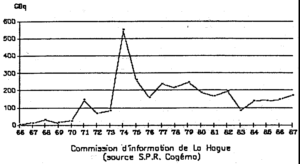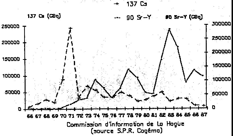 Strontium-Yttrium 90 Les isotopes 89 et 90 du Strontium sont des produits de fission de l'uranium. Ils constituent l'une des principales sources de la radioactivité des retombées consécutives à un essai nucléaire et entrent dans la composition des rejets des centrales nucléaires et des usines de traitement du combustible usé. On observe une évolution croissante inverse de celle du Césium 137 qu'on a placé pour mémoire sur le même graphique. Ainsi, la part d'activité du Strontium-Yttrium 90 rejeté a augmenté durant ces 22 ans: 1% en 1970, 6% en 1980 et 8% en 1987, contrairement à celle du Césium 137 (29% en 1970, 3% en 1980 et 1% en 1987) (voir page 23). ![]() p.10