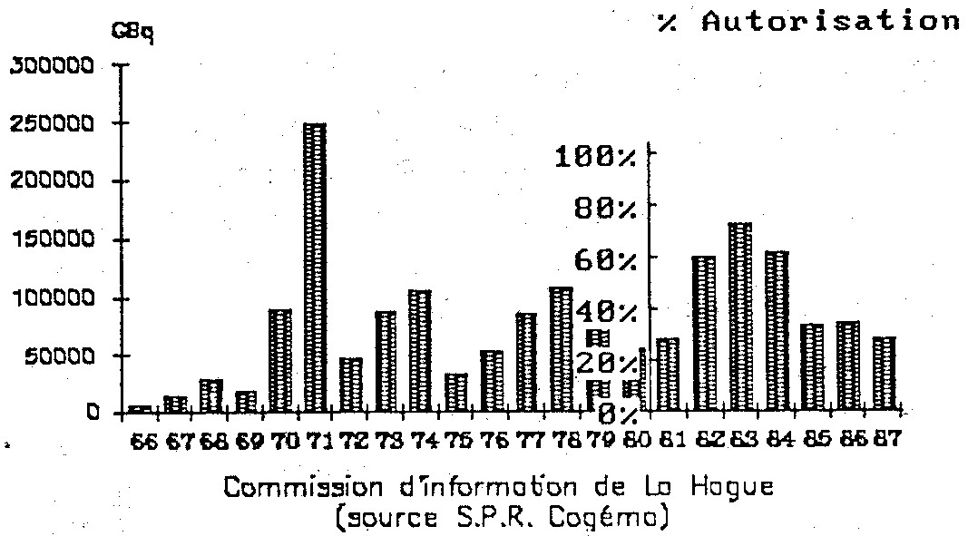 Il faut noter que la pente de cette droite est nettement plus faible que celle des volumes rejetés, ce qui est la preuve d'une amélioration des procédés de retraitement. De même, on peut remarquer que, si l'analyse de la tendance était faite de 1982 à I987, la pente des activité, rejetées serait décroissante. Cette amélioration récente est à souligner car ces radioéléments ont des périodes relativement longues (30 ans). Les pourcentages rejeté, par rapport au rejet maximum autorisé sont passés de 74% en 1983 à 30% en I987. REJETS de STRONTIUM 90 + CESIUM 137 EN MER