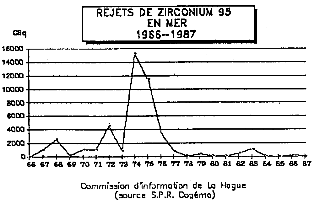 Zirconium 95 Lié, comme le Ruthénium 103, au retraitement des combustibles de la filière Graphite-Gaz, le Zirconium 95 voit son activité disparaître avec la fin du recyclage de ces combustibles à La Hague. Le pic enregistré en 1974 doit être mis en relation avec un plus fort tonnage retraité cette année-là: 635 T d'Uranium métal, soit trois fois plus qu'en 1972 ou 1973 (réf. (3) page 190). Tonnage métal retraité: 1972: 250 - 1973: 213 - 1974: 635 - 1975: 443 - 1976: 218 - 1977: 351. (suite)