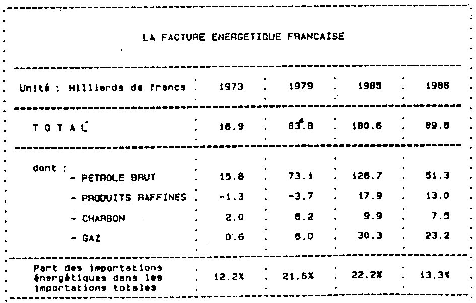 a) L'approvisionnement énergétique de la France repose, en grande partie, en l'état actuel de la société et de son appareil productif, sur des ressources importées (54% en 1986): pétrole, gaz, charbon et, dans une moindre mesure, uranium. Cette importation représente une part importante du commerce extérieur du pays et pèse sur la balance des échanges (la «facture énergétique») surtout en période de prix élevés de l'énergie importée, notamment le pétrole, prix sur lesquels un pays comme la France a peu de prise et qui est soumis égaiement aux fluctuations du taux de change du dollar. L'accalmie actuelle sur les cours du pétrole ne doit pas faire oublier la rapidité des fluctuations possibles et la remontée inéluctable à moyen et long terme. b) A ces considérations macroéconomiques s'ajoute une dimension majeure: le marché pétrolier mondial est et restera largement dépendant des réserves d'hydrocarbures les plus abondantes, et mobilisables à très faible coût, concentrées dans la région du Golfe arabo-persique. Cette donnée détermine fortement la politique de marchands d'armes pratiquée par les grandes puissances à l'égard des Etats et des populations de cette région du monde. Elle explique les soutiens simultanés, avoués ou non, aux protagonistes du conflit Iran-Irak dans des limites compatibles avec le maintien de la «liberté de navigation» dans les eaux du Golfe. Il est temps de rompre avec cette stratégie du bord du gouffre dans laquelle l'Etat français est gravement impliqué. p.2