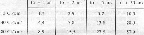 Il est dit par les experts soviétiques que les contours d'activité surfacique n'ont pas varié sensiblement depuis mai 1986 (Y. Izraël, Pravda 20 mai 1989). Nous ferons donc l'hypothèse simplificatrice d'une contamination constante au cours du temps en Cs 137 avec au départ 2 fois plus de Cs 137 que de Cs 134 pour des activités surfaciques en Cs 137 de 15, 40 et 80 Ci/km2 (555 kBq/m2; 148 106 Bq/m2; 2,96. 106 Bq/m2). Les équivalents de dose efficace dus aux Cs 137 et 134 sont en rem: ![]() Or les doses «admissibles» post Tchernobyl sont en URSS, en dose externe et interne, de 10 rem la 1ère année, 3 rem la 2ème année. On voit qu'avec un territoire considéré comme pas trop «sale» à 15 Ci/km2 (puisqu'on considère que sur un tel territoire on n'atteindra vraisemblablement pas les 35 rem «acceptables» sur une vie), il ne faut pas que la contamination interne par ingestion d'aliments «sales» entraîne une dose dépassant 1,8 rem la 2ème année ; on comprend qu'il faille évacuer les territoires plus pollués puisque la dose externe seule contribue déjà à 3,4 rem la 2e année sur un sol à 40 Ci/km2. 3) La charge en Césium