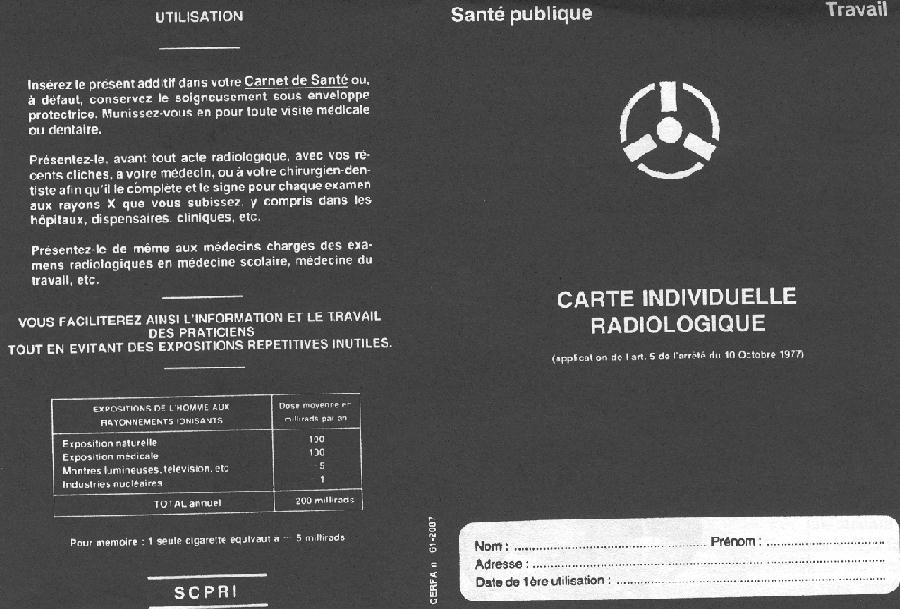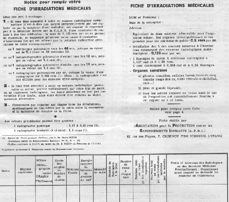 J'ai appris récemment que le ministère français de la santé publique et celui du travail diffusent une carte individuelle radiologique, dont un exemplaire ci-joint. Dès le début de l'action de l'ACDR (Association Contre le Danger Radiologique, première dénomination de l'APRI), nous avions mis au point avec le Dr Pierre Pizon une fiche d'irradiations médicales, dont un exemplaire ci-joint. La comparaison de ces 2 documents m'incite à écrire à ces deux ministres. Voici le projet de cette lettre que je vous serais très reconnaissant de critiquer (textes à corriger, autres questions à poser, ordre de présentation des questions). |