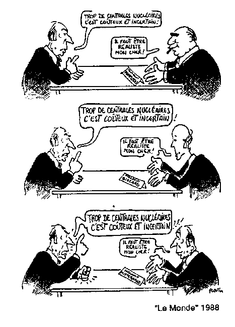 La démarche probabiliste qui fait considérer l'accident grave (fusion du cœur avec perte de confinement) comme trop peu probable pour être envisagé, est en contradiction flagrante avec les conceptions actuelles des spécialistes français de la sûreté nucléaire. Nous pouvons lire dans un rapport officiel les jugements suivants concernant l'approche probabiliste des accidents graves: «Plus les événements sont improbables, plus grande est l'incertitude sur le calcul de leur probabilité, de sorte que ce calcul lui-même n'a plus grande signification ... En France, nous n'accordons guère de crédit aux calculs probabilistes pour classer les accidents graves, car nous estimons que l'estimation de ces valeurs très faibles ne repose pas sur une assise scientifique suffisante. Nous préférons nous en tenir à la notion d'événement «concevable» ou «plausible» au sens du jugement de l 'ingénieur»[3]. Ce texte a été présenté à une conférence internationale sur la sûreté des réacteurs nucléaires par F. Cogné, Directeur de l'Institut de Protection et de Sûreté Nucléaire du CEA (IPSN), J. Bussac, chef du Département d'Analyse de Sûreté de l'IPSN et J. Pelcé son adjoint. Compte tenu des responsabilités hiérarchiques importantes de ces trois personnes, on est en droit de considérer leur conception comme étant celle des autorités administratives responsables au plus haut niveau de la sûreté nucléaire. Ainsi nous devons admettre que toute conception probabiliste des accidents graves est étrangère à la pensée officielle. Cela signifie en clair que lorsque l'on considère un événement grave «concevable au sens du jugement de l'ingénieur» qui n'a pas été pris en compte pour le dimensionnement de l'installation, on doit en considérer les conséquences sans tenir compte de sa probabilité d'occurrence. Ajoutons la déclaration de P. Tanguy, Inspecteur Général pour la Sûreté et la Sécurité Nucléaire, Direction Générale (EDF) : «Nous faisons tout ce que nous pouvons pour prévenir l'accident grave, nous espérons ne pas en avoir, mais nous ne pouvons pas garantir qu'il ne se produira pas. On ne peut exclure que dans les dix ou vingt ans à venir un accident nucléaire civil se produise dans l'une de nos installations»[4]. Ces accidents graves (majeurs) doivent donc être pris en compte et les rejets qui en résultent doivent être soigneusement étudiés et cela en dehors de toute considération statistique ou probabiliste. Ces études doivent considérer les conditions météorologiques les plus pénalisantes dès lors qu'elles sont possibles et non pas des conditions moyennes. Elles devraient faire partie des dossiers fournis à la population et à ses élus quand les pouvoirs publics sollicitent leur avis lors des enquêtes locales. Une telle étude a été faite en 1985 par l'Agence Financière de Bassin Seine-Normandie pour la centrale nucléaire de Nogent-sur-Seine. Celle-ci avait pris pour hypothèse de travail le rejet maximum envisagé comme possible par la CEE. Cette étude avait été contestée par l'IPSN dans un document confidentiel qui n'admettait qu'un rejet bien moindre dans le pire des cas possibles. Cependant le document reconnaissait: «Néanmoins, pour un accident de type S3, même avec des hypothèses plus réalistes sur les transferts de radioactivité, l'activité volumique de l'eau de la rivière au droit des stations de pompage pourrait conduire à s'interroger sur la suspension momentanée de certains pompages». En effet, le document précisait que la concentration en Iode 131 dans la Seine pourrait atteindre 400 fois la concentration maximale reconnue comme admissible par les organismes officiels et cela «sur un temps sensiblement plus long que celui annoncé dans l'étude de l'AFBSN» (c'est-à-dire nettement supérieur à 24 heures). (suite)