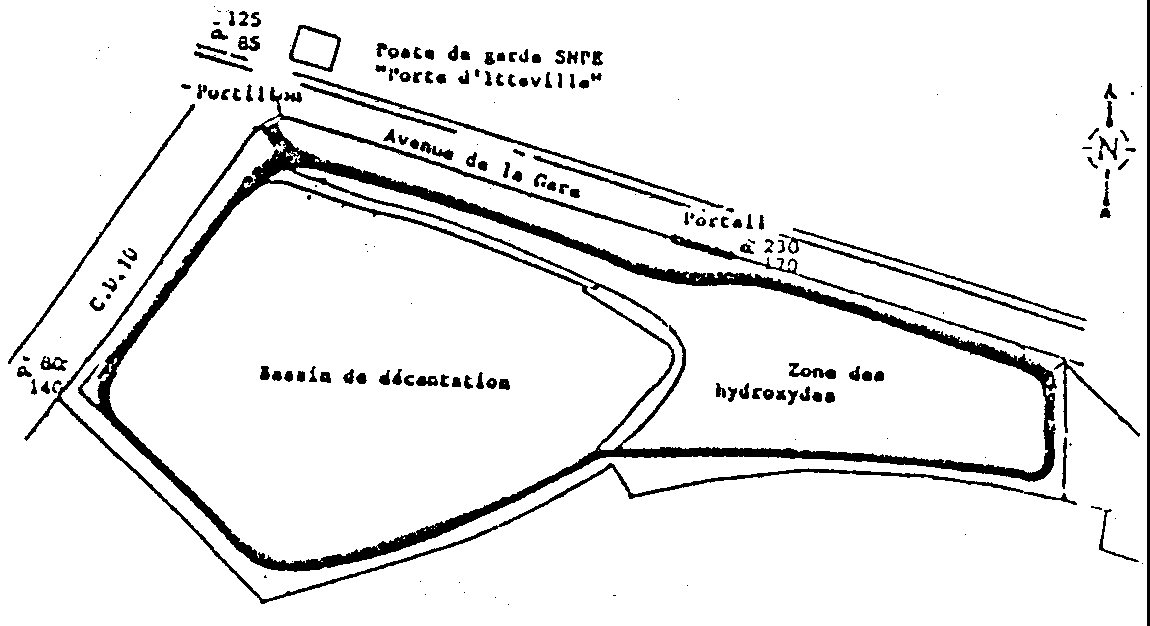 3.2. Parc à hydroxydes · Surface: 3.500 m2 (appartenant à la SNPE) · Sont entreposés environ 2.000 tonnes d'hydroxydes et 2.500 tonnes de terres (activité totale en 226 Ra: 5 curies). 4. Surveillance de l'environnement 4.1. Surveillance des eaux - 226 Ra Les eaux de surface font l'objet de prélèvements et de mesures tous les 3 mois depuis 1982. Points de prélèvements: 122/amont et 125/aval (Juine) et P5 (Ruisseau Centre de Recherche du Bouchet). Les 3 points de prélèvements sont indiqués sur la figure 1: la valeur moyenne se situe au niveau du 2/1.000 de la valeur admise pour le public (limite dérivée de la concentration dans l'eau pour le public) et la valeur maximale est de l'ordre de 1% de cette même limite. Ces valeurs correspondent à l'activité moyenne des eaux de surface en France. 4.2. Mesures de rayonnements Les valeurs indiquées sur le schéma joint (figure 2) montrent que l'irradiation en limite de site est toujours sensiblement inférieure à la limite d'exposition pour une personne du public qui y séjournerait en permanence. ![]() 4.3. Mesures du radon Des mesures récentes faites par l'Institut de Protection et de Sûreté Nucléaire (IPSN) ont montré que pour le point le plus exposé, c'est-à-dire le poste de garde du Centre de Recherche du Bouchet, la valeur atteinte correspond à l'activité moyenne du radon dans les habitations françaises. Elle sera encore réduite après les aménagements projetés. Commentaire Gazette: L'activité de 1 millicurie par tonne classe ce dépôt dans la catégorie installation soumise à autorisation, d'autant plus que la quantité totale «stockée» sur le site est de l'ordre de 50 Curies. p.7